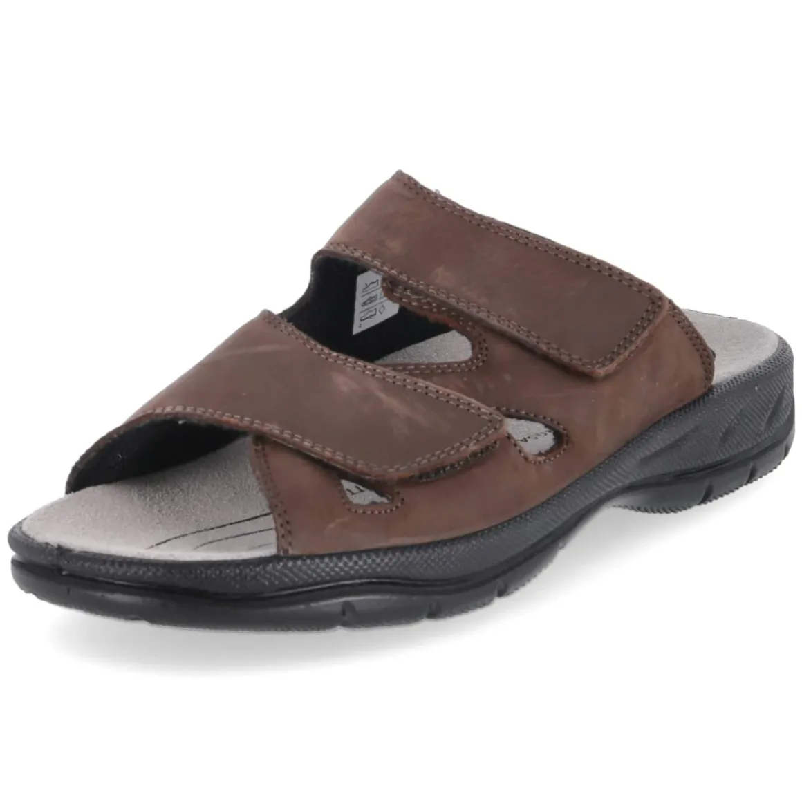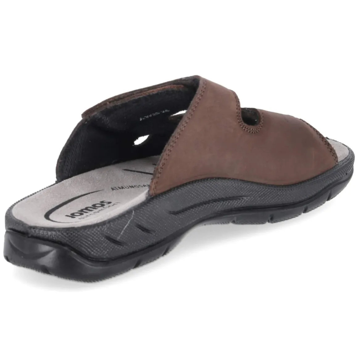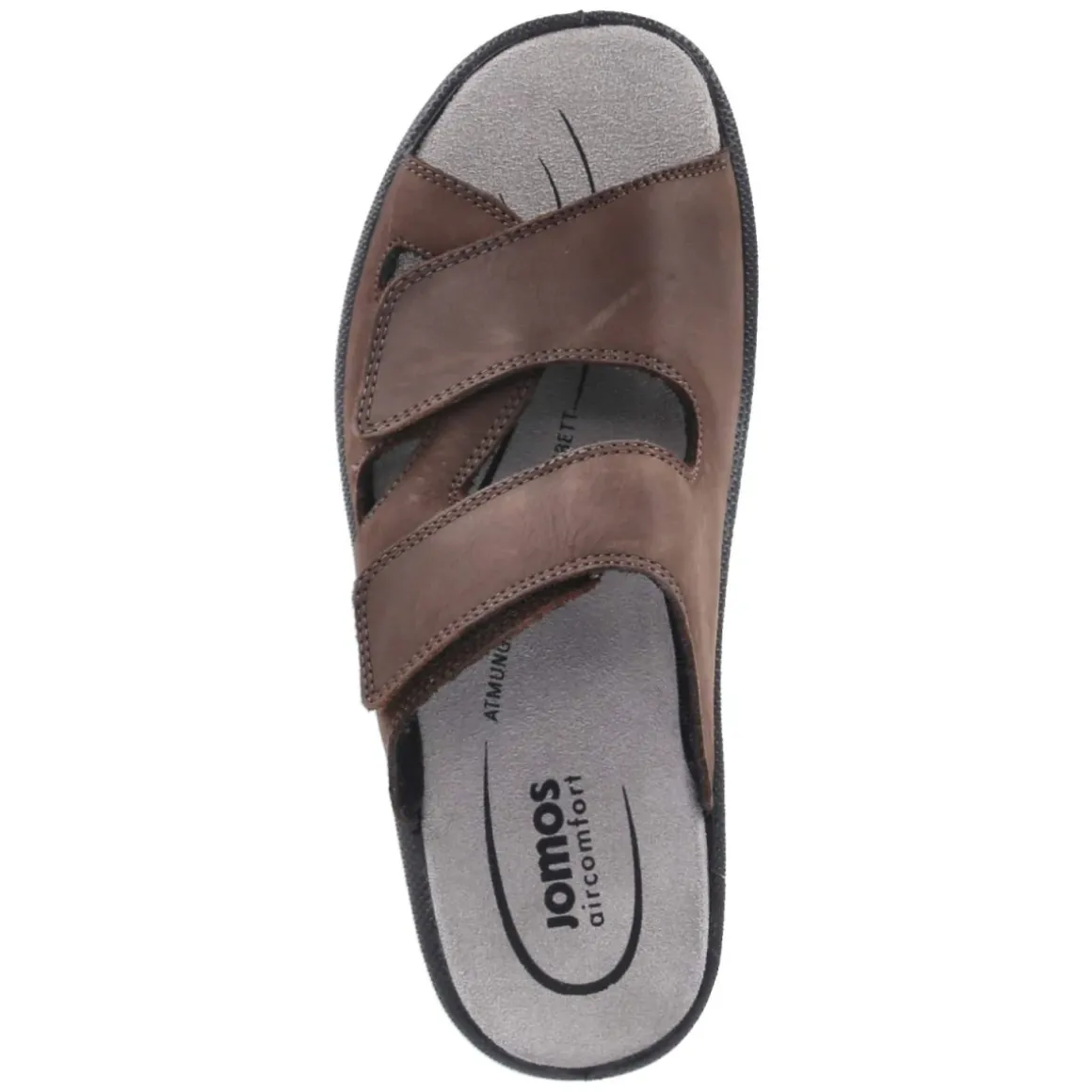 Diese Herren-Pantoletten von Jomos verbinden langlebiges Echtleder mit alltagstauglichem Komfort. Das Obermaterial aus weichem Rauleder liegt angenehm am Fuß, während die lederne, vorgeformte Decksohle stabilen Halt bietet. Zwei praktische Klettriemen erlauben eine individuelle Weiteneinstellung und geben sicheren Sitz, ohne zu drücken. Das wattierte Textilfutter sorgt für ein sanftes Tragegefühl, die flexible Laufsohle mit verlässlichem Grip unterstützt bei jedem Schritt – zuhause, in der Stadt oder auf dem Weg in den Urlaub. Die offene Schuhspitze schenkt angenehme Luftzirkulation an warmen Tagen, die Passform fällt normal aus. In klassischem Braun lässt sich das Modell vielseitig kombinieren und begleitet Erwachsene zuverlässig durch den Sommer. Modetipp: Zu Leinenhose und kurzärmligem Hemd entsteht ein gepflegter Casual-Look, der durch einen braunen Ledergürtel harmonisch abgerundet wird.