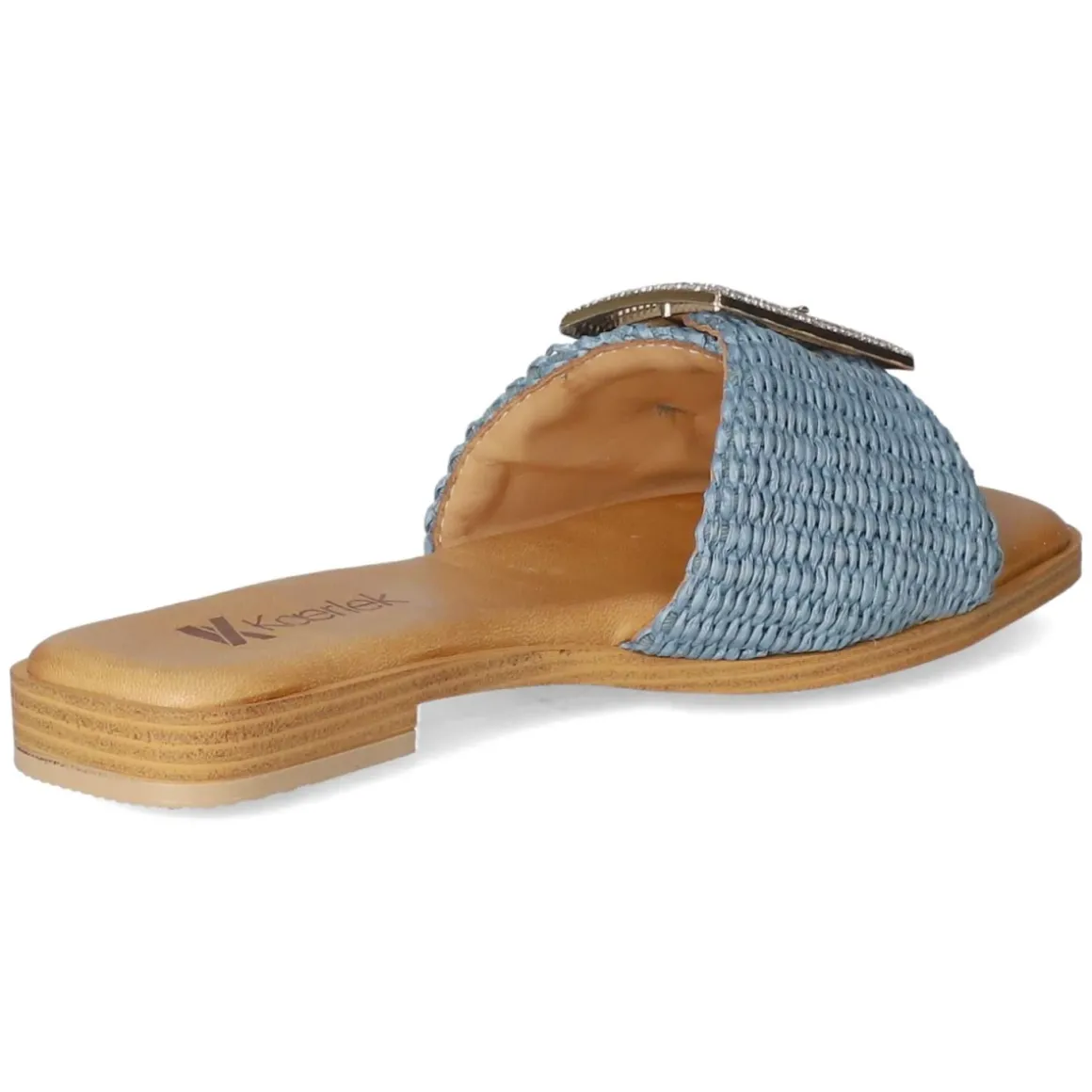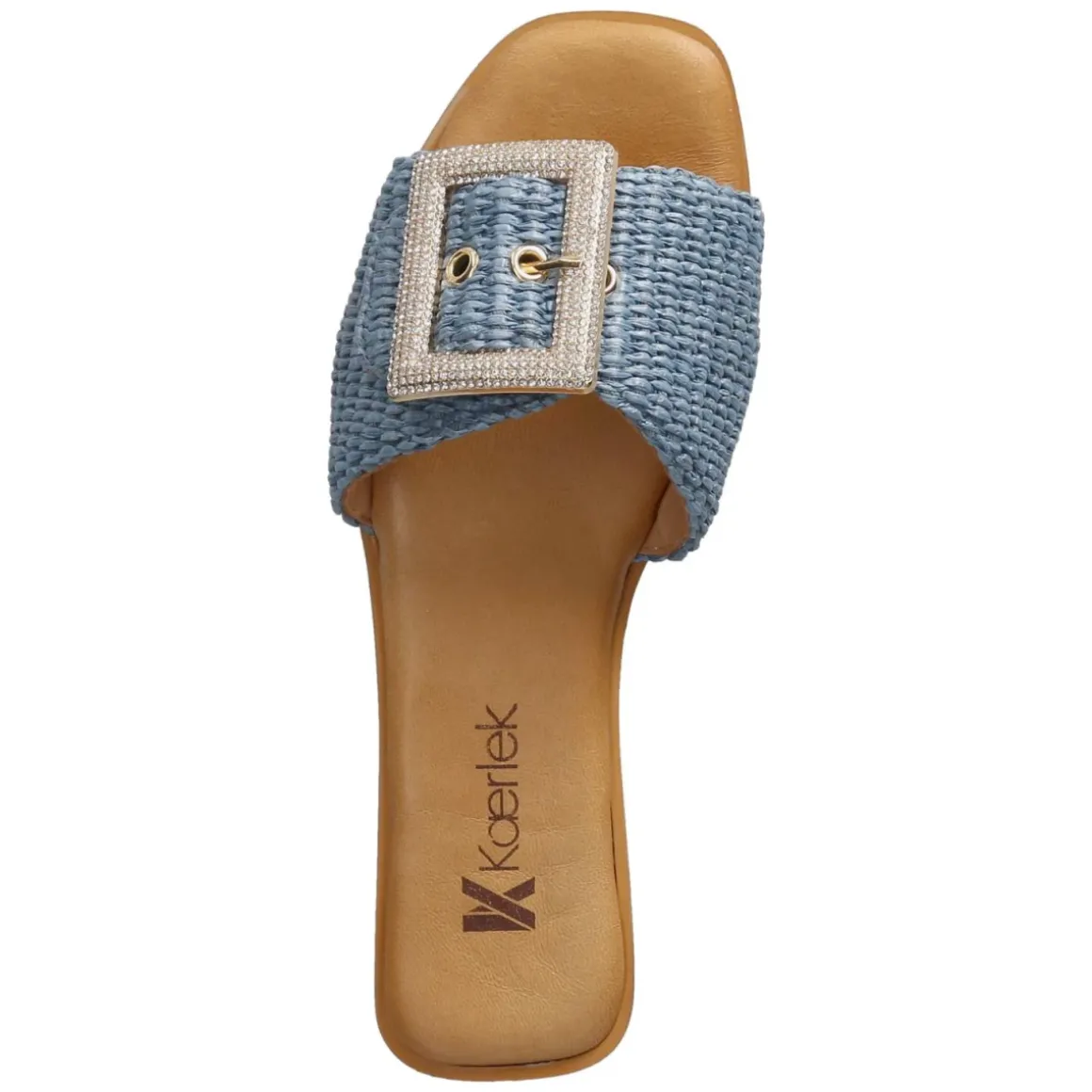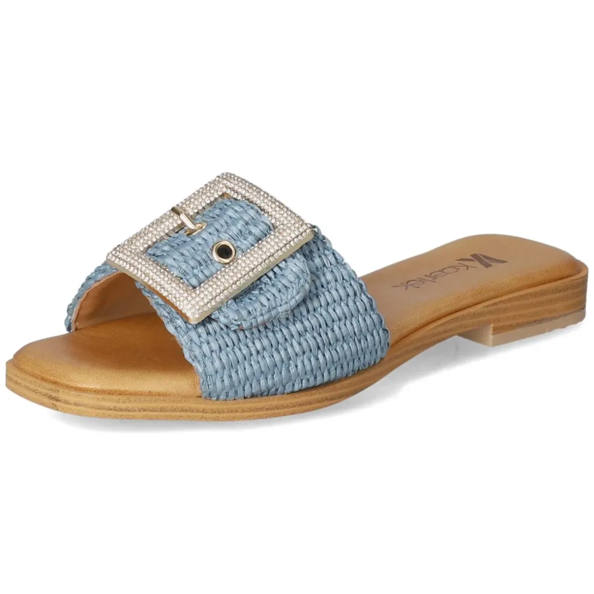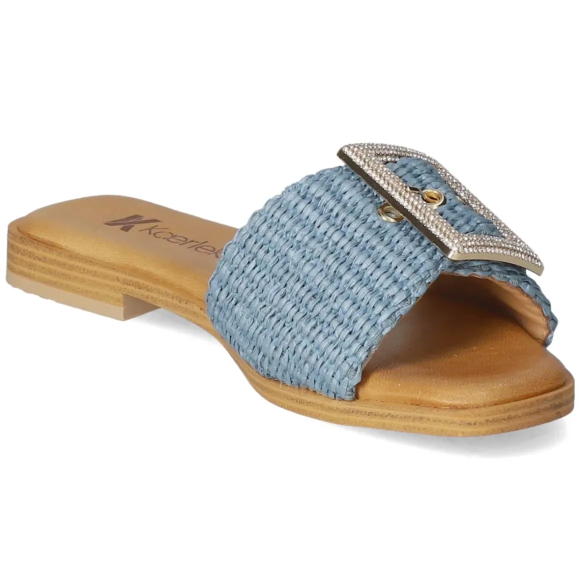 Mit den Pantoletten JEANS von Kaerlek zeigt sich urbaner Sommerstil in maritimem Blau. Die offene Schuhspitze und die modern designte Synthetik verleihen eine leichte Optik, während die geflochtene Sisaloptik dem Plateau eine lässige, mediterrane Note gibt. Die goldfarbene Schnalle mit funkelnden Schmucksteinen setzt einen eleganten Akzent und lässt sich praktisch verstellen. Innen sorgt die lederne Decksohle zusammen mit dem weich gepolsterten Fußbett für angenehmen Tragekomfort, die flexible, rutschhemmende Laufsohle bietet zuverlässigen Halt auf glatten Wegen. Das Modell fällt normal aus und passt sich mühelos an unterschiedliche Alltagslooks an – von City bis Strandpromenade. Modetipp: Zu einem weißen Leinenkleid und einer strukturierten Basttasche entfaltet das Jeansblau seinen frischen Kontrast, filigraner Goldschmuck nimmt die Schnallendetails stilsicher auf.