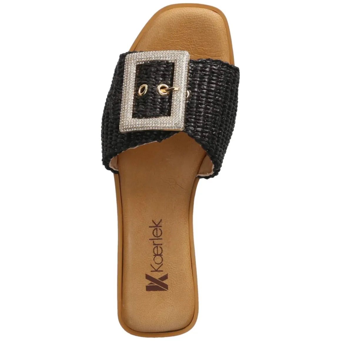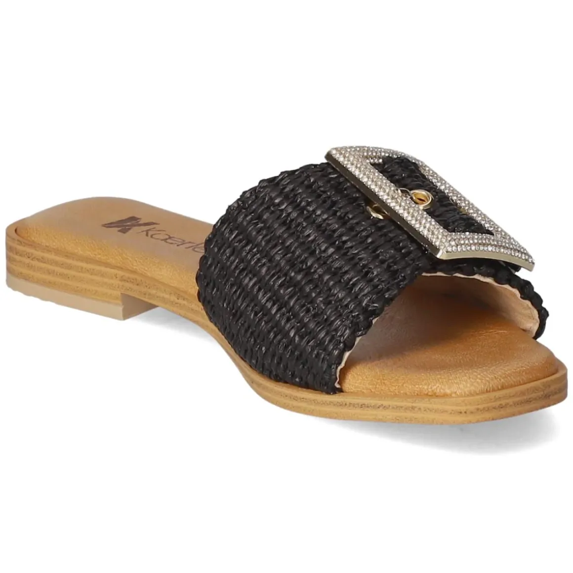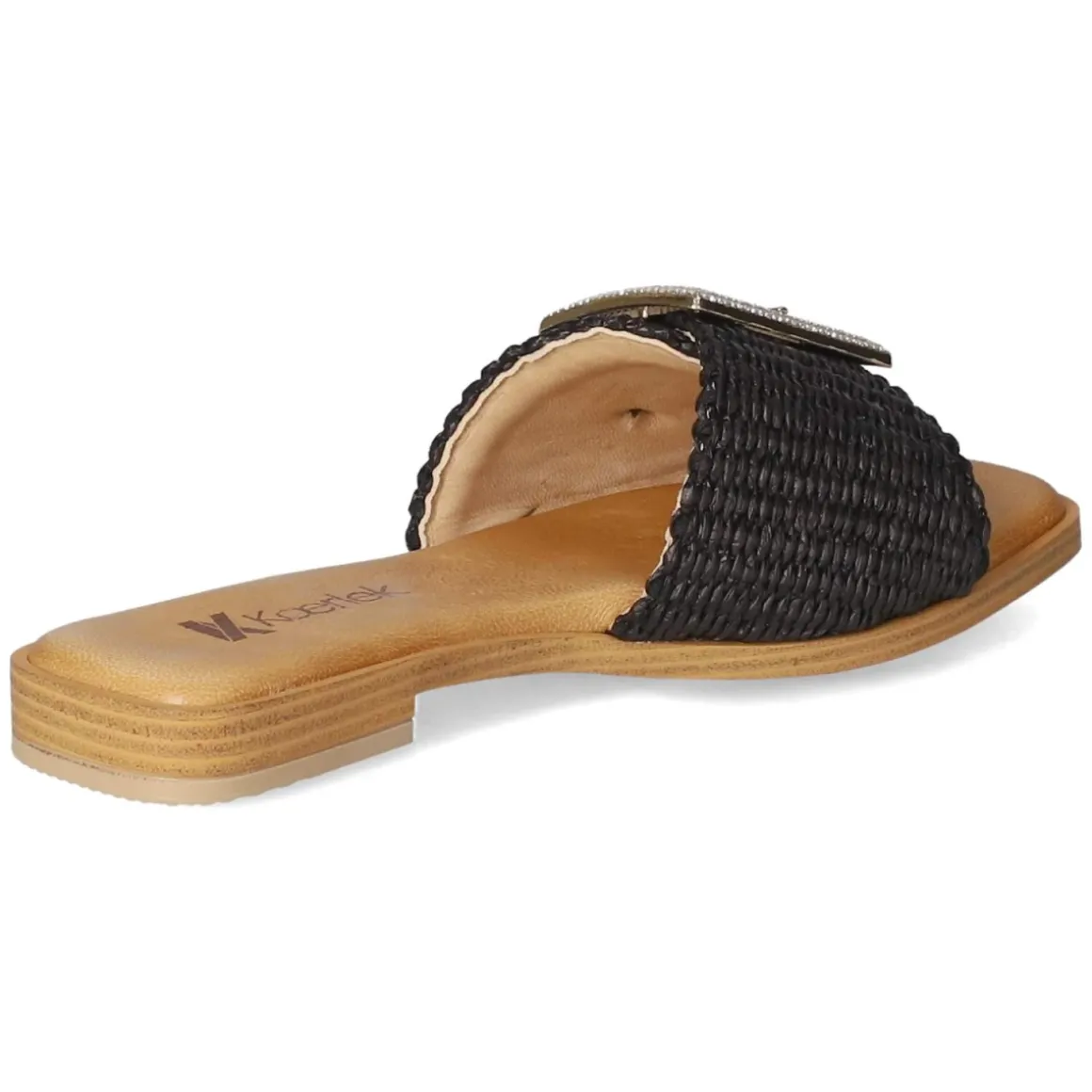 Die Pantoletten NERO von Kaerlek verbinden zurückhaltende Eleganz mit sommerlicher Struktur. Das schwarze Obermaterial aus Synthetik setzt den modernen Material-Mix in Szene, während die geflochtene Sisaloptik an der Sohle einen natürlichen Akzent liefert. Die goldfarbene Schnalle mit funkelnden Schmucksteinen ist nicht nur ein Blickfang, sondern erlaubt ein unkompliziertes Anpassen. Ein weich gepolstertes Fußbett mit Decksohle aus Leder sorgt für angenehmen Komfort, die flexible, rutschhemmende Laufsohle für verlässlichen Halt. Mit offener Schuhspitze und normal ausfallender Passform eignen sich die Pantoletten für vielfältige Anlässe vom Café bis zur Strandpromenade. Modetipp: Zu Leinen-Set in Sand und schwarzem Top kombinieren, dazu filigraner Goldschmuck und eine Bast-Clutch für ein harmonisches Finish.