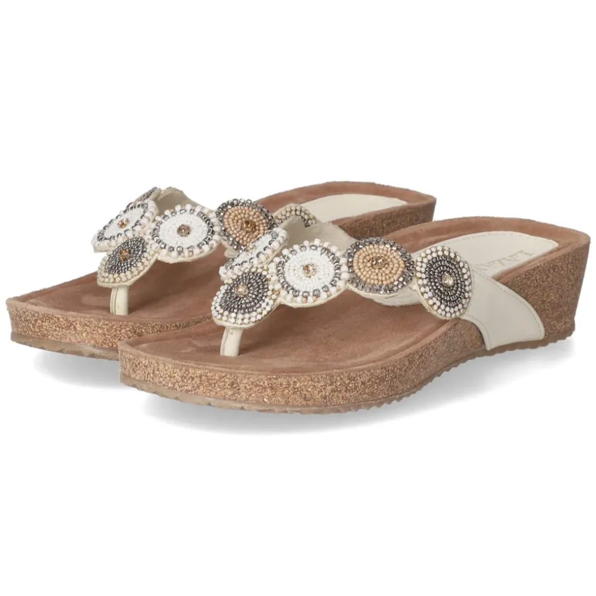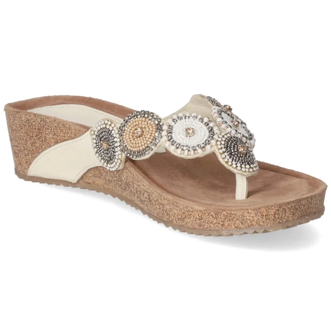 Sommerlicher Auftritt mit den Pantoletten von LAZAMANI: Das weiße Glattleder sorgt für einen frischen Look, während die offene Spitze und der legere Schnitt den Charakter angenehm entspannt halten. Auf der Decksohle aus Leder liegt ein weich gepolstertes Fußbett, das den Fuß sanft abfedert. Sieben kreisförmige Ornamente mit funkelnden Schmucksteinen setzen ein elegantes Highlight und verleihen dem robusten Material-Mix eine feminine Note. Dank flexibler, griffiger Laufsohle und dem praktischen Schlupfeinstieg ohne Verschluss bleibt der Gehkomfort hoch. Das Modell fällt normal aus und lässt sich mühelos in den Alltag integrieren, von Cityspaziergang bis Terrassenabend. Modetipp: Zu naturfarbenen Leinen-Culottes und einem cleanen Tanktop kombinieren, dazu eine Basttasche und filigraner Goldschmuck für einen lässig-edlen Look.
