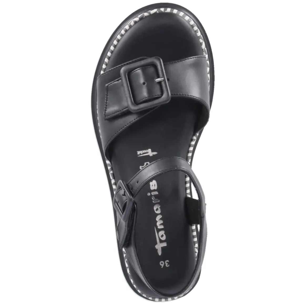 Diese Damen-Sandalen von Tamaris setzen auf zeitloses Design und hohen Tragekomfort. Schwarzes Glattleder umschließt den Fuß in klaren Linien, die offene Schuhspitze sorgt für luftiges Gefühl an warmen Tagen. Zwei Klettverschlussriemen mit verstellbarer Schnalle erlauben eine passgenaue Einstellung, während das gepolsterte Fußbett auf einer Decksohle aus Leder sanfte Dämpfung bietet. Das langlebige Echtleder zeigt sich formstabil und anschmiegsam, die starke Laufsohle gewährleistet Halt auf verschiedensten Untergründen. Eyecatcher ist das geometrische Rahmenmuster im Retrodesign in Schwarz-Weiß, das dem minimalistischen Look eine grafische Note verleiht. Der Schnitt fällt normal aus und erleichtert die Größenauswahl. Modetipp: Besonders stimmig wirkt das Modell zu einer monochromen Kombination aus schwarzer Culotte und feinem Stricktop, akzentuiert mit silbernen Kettendetails.