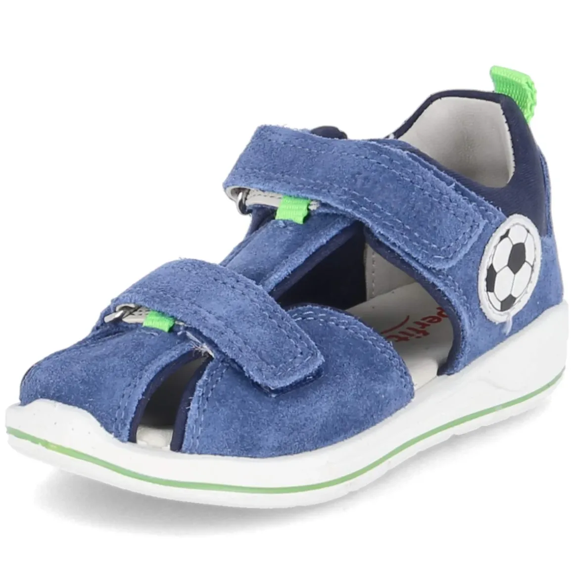 Diese blauen Superfit Sandalen bringen Spielplatz-taugliche Robustheit und weichen Tragekomfort zusammen – ideal für Kleinkinderfüße in Bewegung. Der Material-Mix aus Leder und Textil hält stand, während die hautfreundliche Lederdecksohle für ein angenehmes Fußklima sorgt. Zwei praktische Klettriemen bieten schnellen Halt und lassen sich passgenau regulieren; die WMS-Schuhweite Mittel unterstützt eine kindgerechte Passform. Ein gepolsterter Einstieg und der verstärkte Fersenbereich geben zusätzliche Stabilität, die runde Schuhspitze lässt genügend Zehenfreiheit. Die flexible, rutschhemmende Laufsohle begleitet sichere Schritte auf glatten Fliesen wie auf dem Spielplatz. Ein seitliches Fußballmotiv setzt einen sportlichen Akzent. Fällt normal aus. Modetipp: mit leichten Jeansshorts und einem Ringelshirt kombinieren – dazu farblich abgestimmte Socken für kühle Tage.