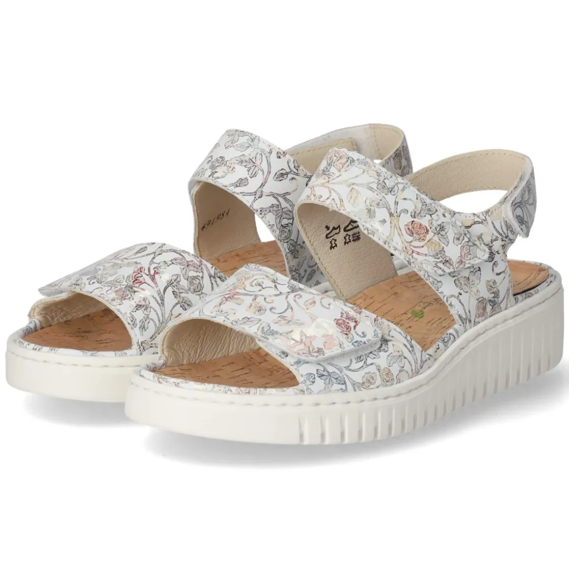 Die Sandalen VALERIE von Waldläufer verbinden robuste Materialien mit komfortorientierter Konstruktion. Das Obermaterial aus weichem Rauleder mit floral schimmerndem Mehrfarben-Design setzt sommerliche Akzente, während das Innenfutter aus Leder ein angenehmes Fußklima unterstützt. Drei praktische Klettverschlüsse erlauben eine präzise Anpassung über Rist, Vorfuß und Ferse, ideal für wechselnde Tagesformen. Die offene Schuhspitze sorgt für luftiges Tragegefühl, die flexible, rutschhemmende Laufsohle gibt verlässlich Halt auf unterschiedlichen Untergründen. Ein komfortables Wechselfußbett mit gepolsterter, textiler Deckschicht bietet sanfte Dämpfung und lässt sich bei Bedarf austauschen. Das Modell fällt normal aus und empfiehlt die gewohnte Größe. Modetipp: Das mehrfarbige, florale Schimmern kommt besonders gut zu schlichten Leinenlooks in Creme oder Sand zur Geltung; ein Midirock und dezente Schmucktöne greifen den Glanz elegant auf.