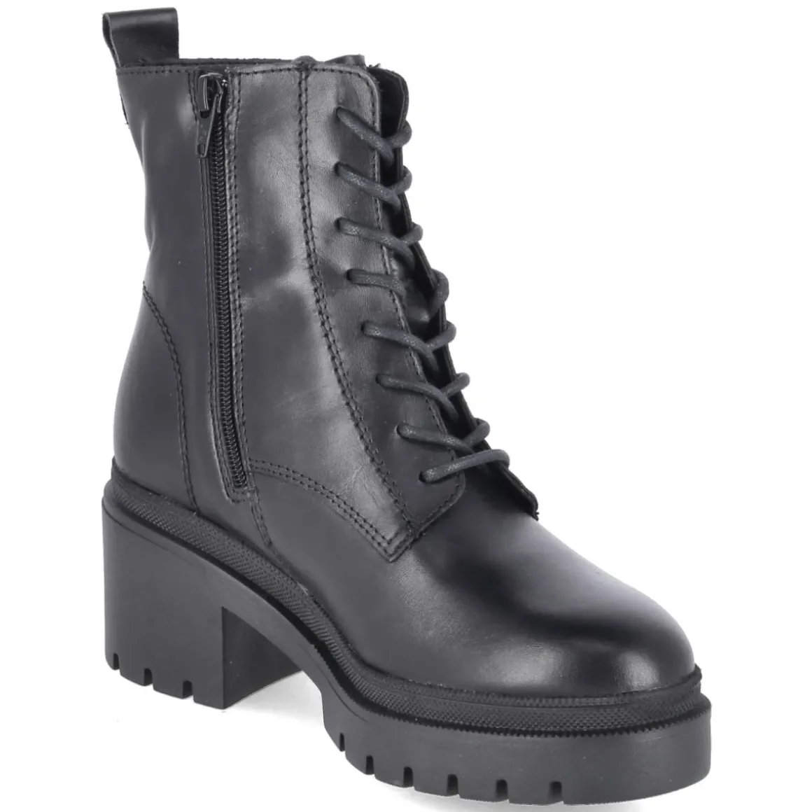 Der Tamaris Schnürboot in klassischem Schwarz verbindet urbane Eleganz mit verlässlichem Komfort. Das Obermaterial aus langlebigem Echtleder zeigt eine glatte, edle Oberfläche und wird durch eine verstärkte Ferse und eine praktische Anziehlasche ergänzt. Für bequemes An- und Ausziehen sorgt die Kombination aus Schnürung und seitlichem Reißverschluss, während ein gepolstertes Fußbett und die rutschfeste Profilsohle angenehmen Halt im Alltag bieten. Der 7,5 cm hohe Blockabsatz steht stabil, das kleine Plateau von ca. 3 cm entlastet den Fuß zusätzlich. Mit runder Schuhspitze, normaler Passform und einer Decksohle aus Textil & Synthetik überzeugt der Damen-Boot als vielseitiger Begleiter von früh bis spät. Modetipp: Zu Midirock und Strickpullover entsteht ein moderner City-Look, akzentuiert durch einen strukturierten Wollmantel.