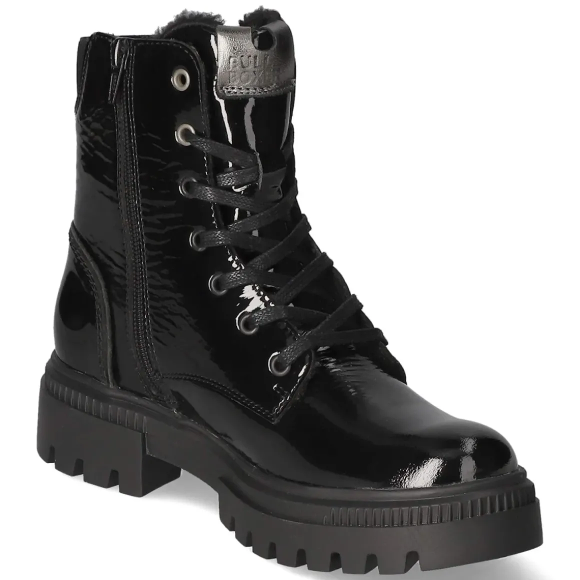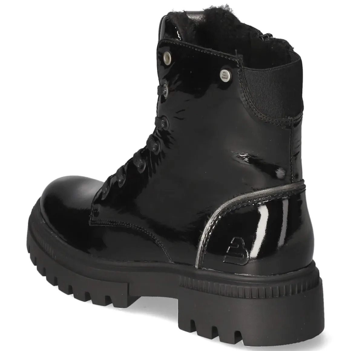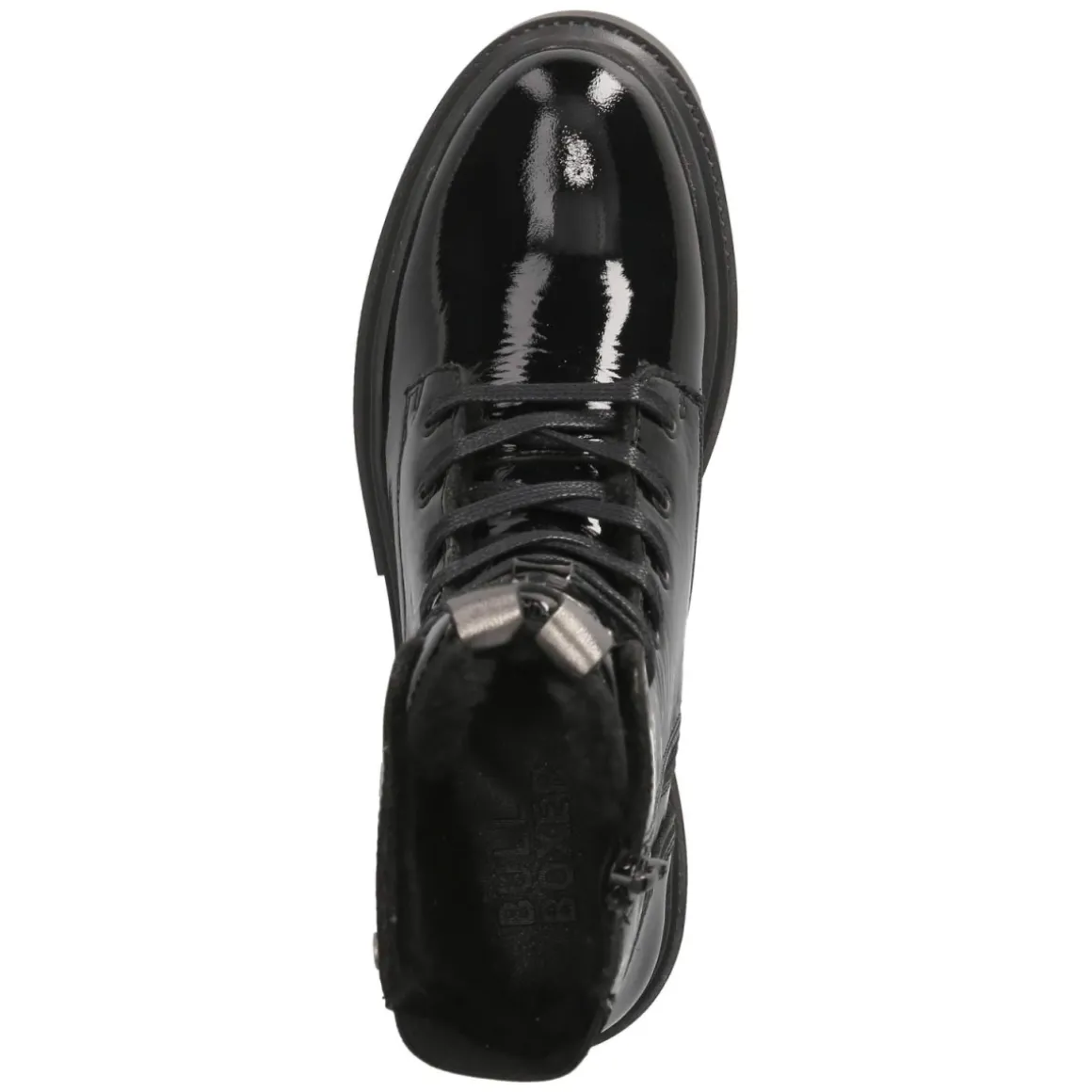 Der Bullboxer Schnürboot punktet mit eleganter Lackoptik in tiefem Schwarz und einem 5 cm hohen Blockabsatz, der sicheren Stand verleiht. Das Modell fällt normal aus, die runde Spitze und das gepolsterte Fußbett mit textiler Decksohle sorgen für angenehmen Komfort im Alltag. Ein leichtes Futter wärmt an kühlen Tagen, während verstärkte Ferse und kleiner Elastikeinsatz im Einstiegsbereich die Passform abrunden. Die Kombination aus Schnürung und zusätzlichem Reißverschluss erleichtert den Einstieg und erlaubt individuelle Anpassung. Silberne Akzente und feine Markendetails setzen moderne Highlights. Die flexible, rutschfeste Profilsohle begleitet zuverlässig durch urbane Wege – vom Büro bis zum Abend. Modetipp: Besonders wirkungsvoll zu cropped Wide-Leg-Jeans und Wollmantel oder als Glanzkontrast zum fließenden Satinkleid.