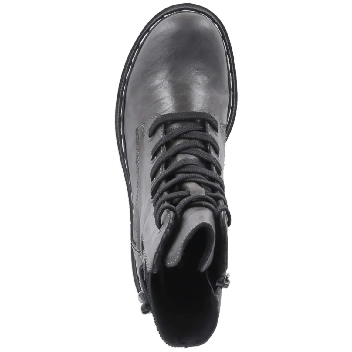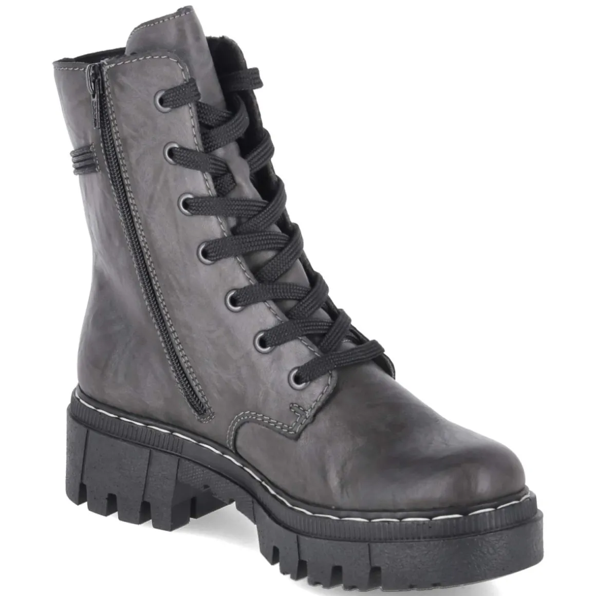 Diese grauen Schnürboots von Rieker setzen auf einen gelungenen Mix aus Komfort und urbanem Stil. Das pflegeleichte Synthetik-Obermaterial zeigt eine leichte Knautschoptik, während der 5 cm hohe Blockabsatz mit kleinem Plateau dezent streckt und sicheren Stand vermittelt. Dank rutschfester Profilsohle, verstärktem Fersenbereich und rund gearbeiteter Spitze entsteht ein stabiles, entspanntes Laufgefühl. Das relaxtes Leichtgewicht punktet mit weichem Fußbett und Textil-Decksohle, das leichte Futter wärmt an kühlen Tagen. Schnürsenkel in Kombination mit Reißverschluss erleichtern den Einstieg und erlauben eine passgenaue Regulierung; ein seitlicher Stretcheinsatz sowie ein zierendes Band ergänzen das Design. Die Passform fällt normal aus und bietet verlässliche Größe. Modetipp: Zu grauen Wide-Leg-Jeans, meliertem Strickpullover und langem Wollmantel in Creme entsteht ein harmonischer Ton-in-Ton-Look mit modernem Finish.