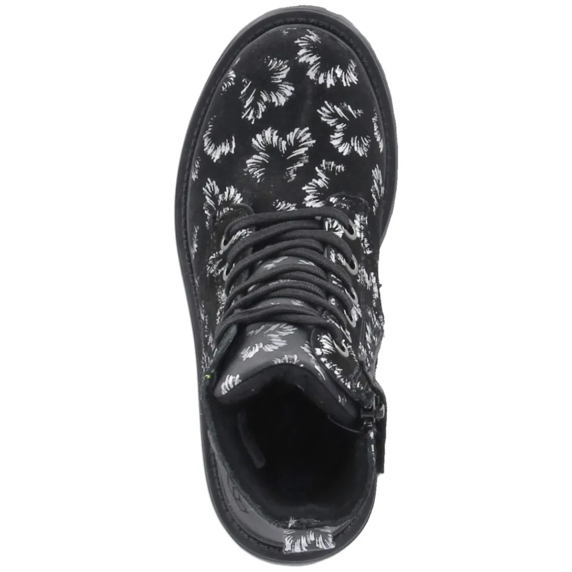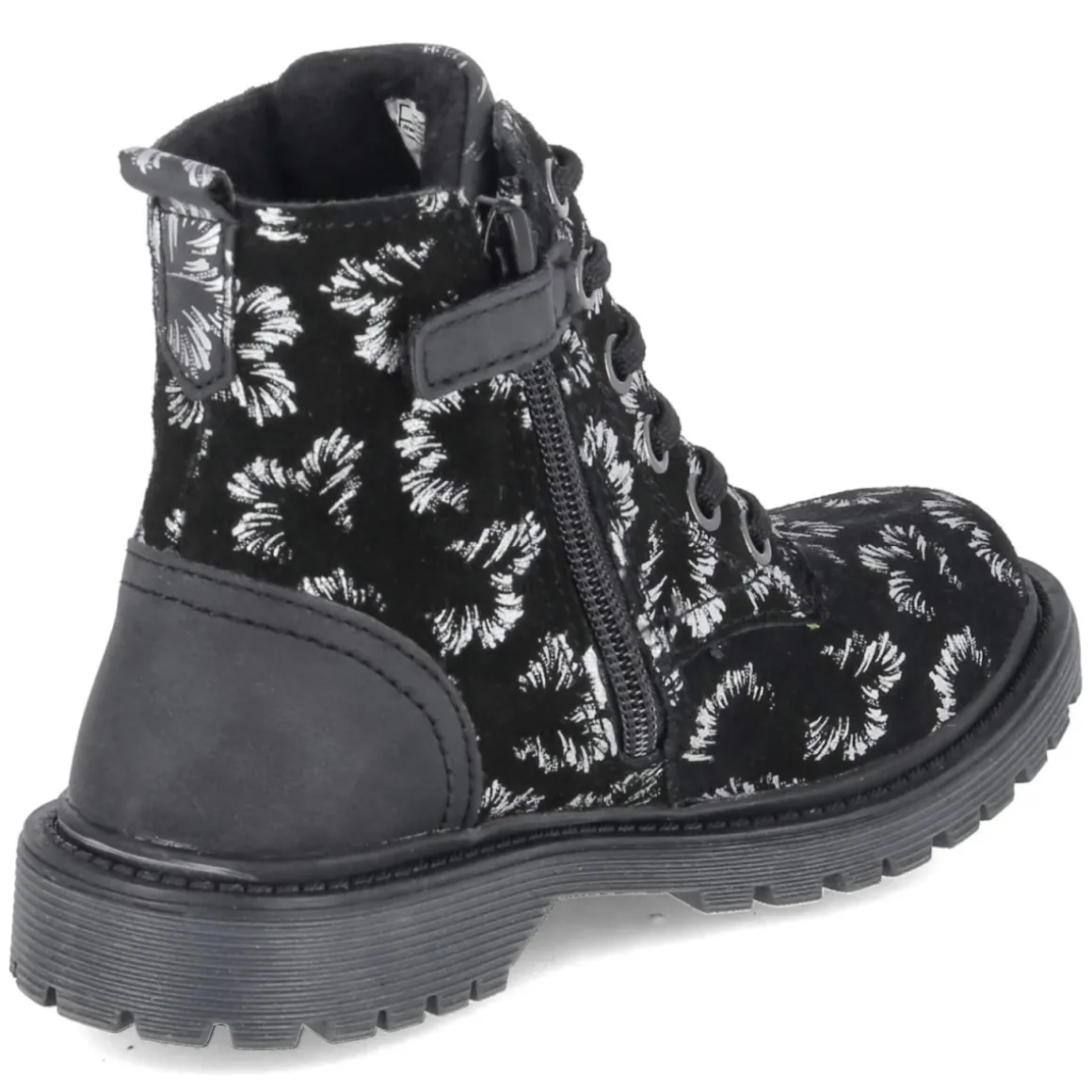 Der Schnürboots MALATI von Lico verbindet robuste Alltagstauglichkeit mit einem verspielten Look. Das Obermaterial aus Leder und Synthetik bildet einen wasserfesten Material-Mix, der Nässe zuverlässig abhält, während die runde Schuhspitze und der 2,5 cm hohe Blockabsatz für angenehmes Abrollen sorgen. Schnürung und praktischer Reißverschluss ermöglichen schnellen Einstieg und sicheren Halt. Innen wärmt ein leichtes Filzfutter, ergänzt durch eine weiche Decksohle aus Textil. Die rutschfeste Profilsohle gibt Stabilität auf nassen Wegen, die verstärkte Ferse unterstützt zusätzlich. Hingucker ist der abstrakte Blumenprint in Silber auf schwarzem Grund, der dem gemusterten Design eine edle Note verleiht. Fällt normal aus und passt ideal zu Schulweg, Spielplatz und Stadtbummel. Modetipp: Zu dunkler Skinny-Jeans, Strickpullover und gesteppter Pufferjacke wirken die silbernen Details besonders stimmig.