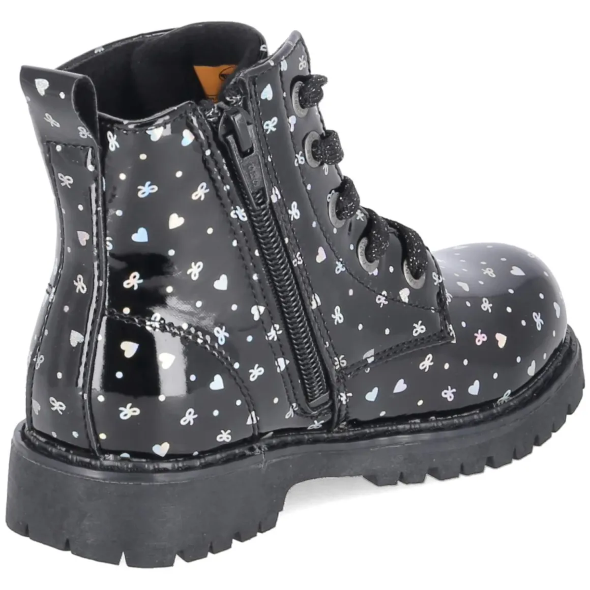 Diese Dockers Schnürboots für Kinder verbinden glänzende Eleganz mit alltagstauglichem Komfort. Die elegante Lackoptik in Schwarz erhält durch den silbernen, bunt schimmernden Print mit Herzchen und Schleifen eine verspielte Note, während Warmfutter und weiche Textildecksohle für Wohlgefühl an kühleren Tagen sorgen. Dank Schnürsenkeln und seitlichem Reißverschluss gelingt der unkomplizierte Einstieg, die Passform fällt normal aus. Der 2,5 cm hohe Blockabsatz, die rutschfeste Profilsohle und der verstärkte Fersenbereich geben sicheren Halt beim Rennen, Toben und auf dem Schulweg. Die runde Schuhspitze bietet genügend Zehenfreiheit, das synthetische Obermaterial zeigt sich pflegeleicht, und die Anziehlasche erleichtert das Anziehen zusätzlich. Modetipp: Besonders hübsch wirkt der Glanz zu Tüllrock und blickdichter Strumpfhose; für den Alltag entsteht mit lässiger Jeans und grobem Strick ein harmonischer Kontrast.