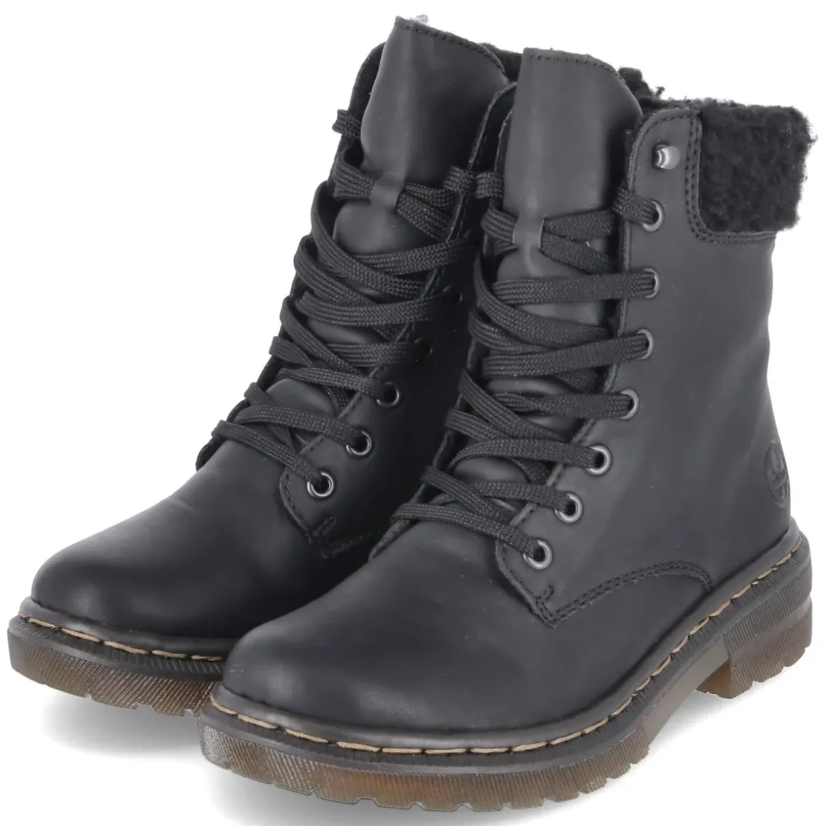 Der schwarze Rieker Schnürboot für Damen verbindet Komfort und Funktion mit urbanem Stil. Das pflegeleichte Kunstleder-Obermaterial und die runde Spitze treffen auf einen stabilen 4-cm-Blockabsatz, der sicheren Halt gibt. Innen sorgt warmes Futter mit weichem Teddycharakter für Behaglichkeit an kalten Tagen, während die textile Decksohle und der gepolsterte Einstieg den Tragekomfort erhöhen. Schnürsenkel und seitlicher Reißverschluss ermöglichen leichtes An- und Ausziehen sowie passgenauen Sitz. Die rutschfeste Profilsohle bietet Trittsicherheit auf winterlichen Wegen. Für Erwachsene konzipiert und im Größenlauf mit dem Hinweis: fällt kleiner aus; die Wahl einer Nummer größer ist empfehlenswert. Modetipp: In Kombination mit einer dunklen Skinny-Jeans, Oversize-Strick und einem langen Wollmantel entsteht ein lässig-eleganter Look für die Stadt.