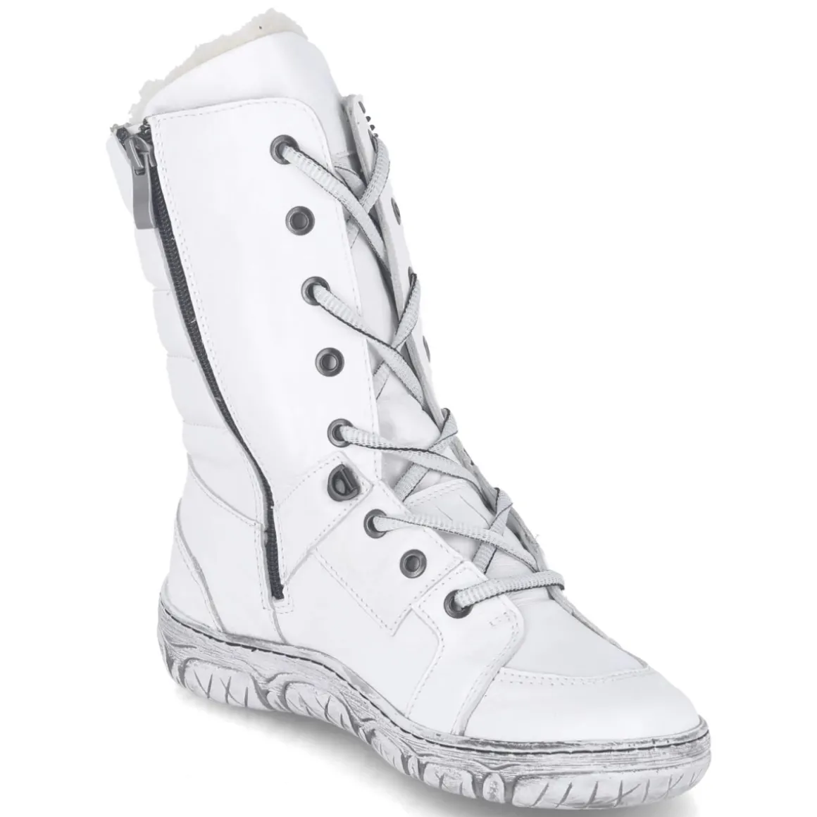 Der Schnürboot von Krisbut vereint funktionale Wärme mit moderner Optik. Glattes, langlebiges Echtleder in strahlendem Weiß trifft auf ein weiches Warmfutter, das an kalten Tagen zuverlässig schützt. Die runde Spitze und der leicht gepolsterte Schaft mit Querstepp-Details sorgen für hohen Tragekomfort, während verstärkte Fersen- und Zehenbereiche zusätzliche Stabilität bieten. Praktisch zeigt sich die Kombination aus Schnürsenkeln und Innenreißverschluss für schnellen Einstieg; außen setzt ein offener Zierreißverschluss einen modischen Akzent. Die textile Decksohle liegt angenehm am Fuß, das herausnehmbare Fußbett ermöglicht individuelle Einlagen. Eine flexible Profilsohle liefert Trittsicherheit auf verschiedenem Untergrund. Der Schnitt fällt größengetreu aus und begleitet Damen stilvoll durch den Alltag. Modetipp: Mit wolligem Mantel, Strickkleid und dicken Rippsocken entsteht ein cleaner Winterlook in Off-White-Nuancen.