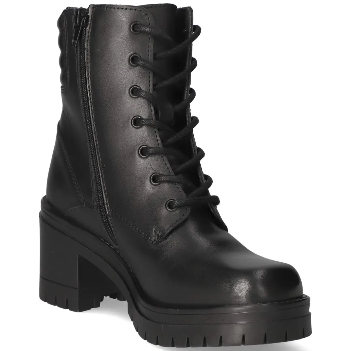 Schnürstiefeletten von Fräulein Frida, gefertigt aus langlebigem Glattleder in tiefem Schwarz, setzen auf klare Linien und alltagstaugliche Eleganz. Der runde Leisten und der 5 cm hohe Blockabsatz sorgen für ein ausgewogenes Verhältnis aus Stabilität und femininer Silhouette. Eine Schnürung ermöglicht individuelle Anpassung, während ein zusätzlicher seitlicher Reißverschluss das An- und Ausziehen komfortabel macht. Die gepolsterte Decksohle aus Synthetik federt Schritte angenehm ab, die verstärkte Ferse bietet Halt, und die rutschfeste Profilsohle gibt Sicherheit auf unterschiedlichen Untergründen. Vier gesteppte Zierstreifen am Einstiegsbereich verleihen eine dezente, markentypische Note. Fällt größengetreu aus und überzeugt im Alltag wie im Office. Modetipp: Für einen modernen Look mit geradem Wollmantel und Cropped-Jeans kombinieren, dazu eine feine Stricksocke leicht sichtbar tragen.