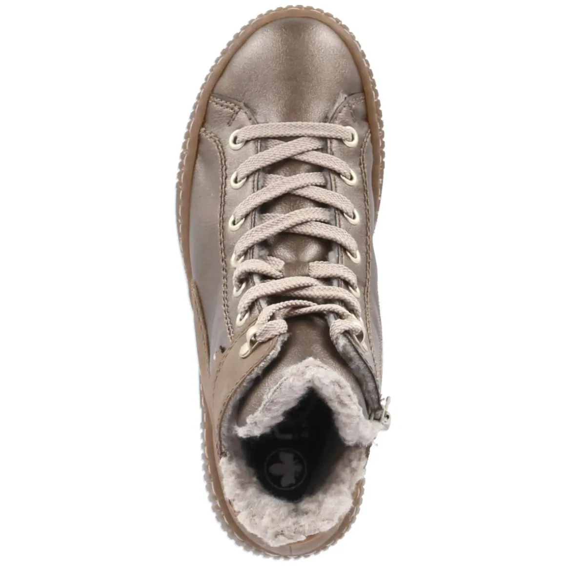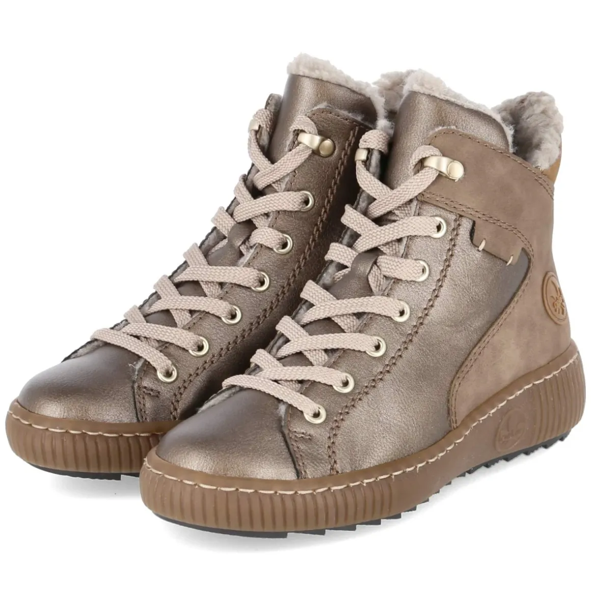 Bronzefarbene Schnürstiefeletten von Rieker setzen mit feinem Metallic-Schimmer ein edles Statement im Alltag. Das Obermaterial aus Kunstleder zeigt sich besonders pflegeleicht, während Warmfutter und Textil-Decksohle angenehm durch kühlere Tage tragen. Die Kombination aus Schnürsenkeln und praktischem Reißverschluss sorgt für eine individuell anliegende Passform und schnellen Einstieg, unterstützt von einem weich gepolsterten Schaft. Als relaxtes Leichtgewicht mit runder Spitze überzeugt das Modell zudem mit einer flexiblen, griffigen Laufsohle für zuverlässigen Halt auf wechselnden Untergründen. Die Passform fällt normal aus und passt damit mühelos in die gewohnte Größe. Modetipp: Zu Straight-Leg-Jeans, einem grob gestrickten Cardigan und einer strukturierten Umhängetasche kommt der bronzene Glanz besonders harmonisch zur Geltung.