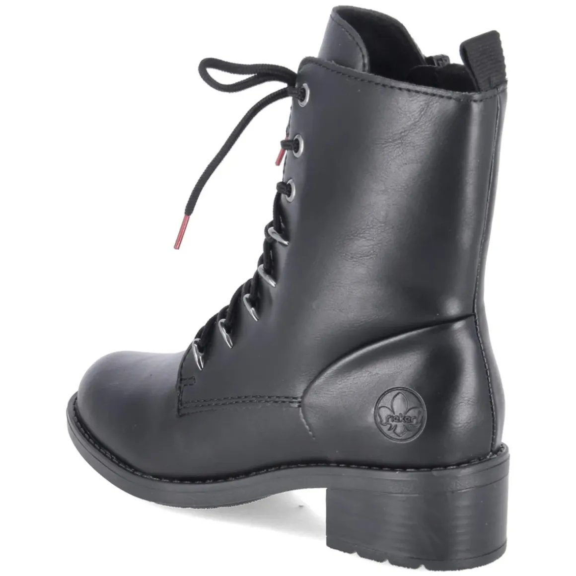 Schwarze Schnürstiefeletten von Rieker, die Komfort und Stil mühelos verbinden. Der 5 cm hohe Blockabsatz sorgt für standfeste Höhe, während die runde Schuhspitze und das gepolsterte Fußbett angenehmen Tragekomfort bieten. Das Obermaterial aus Synthetik überzeugt mit pflegeleichter Oberfläche, die flexible, rutschfeste Laufsohle und die verstärkte Ferse sichern Halt auf urbanen Wegen. Der bequeme Reißverschlusseinstieg wird durch die Schnürung ergänzt, so sitzt der Schaft (ca. 15 cm Höhe, 22 cm Umfang) angenehm am Fuß; die Anziehlasche erleichtert das Hineinschlüpfen. Leichtes Futter wärmt an kühlen Tagen, die Textil-Decksohle schmiegt sich weich an. Die Passform fällt normal aus und eignet sich ideal für Damen im Alltag. Modetipp: Zu Skinny-Jeans, grobem Strick und einem puristischen Wollmantel entsteht ein zeitloser City-Look.