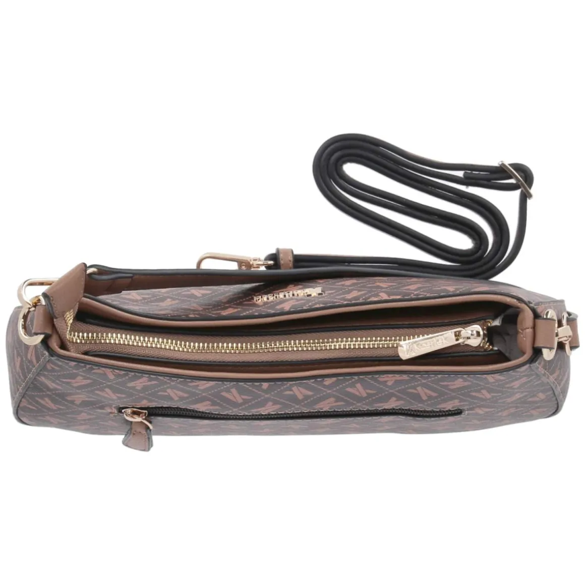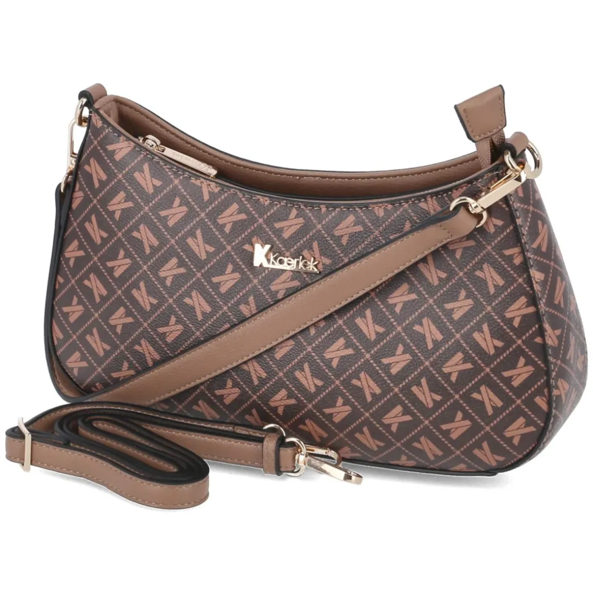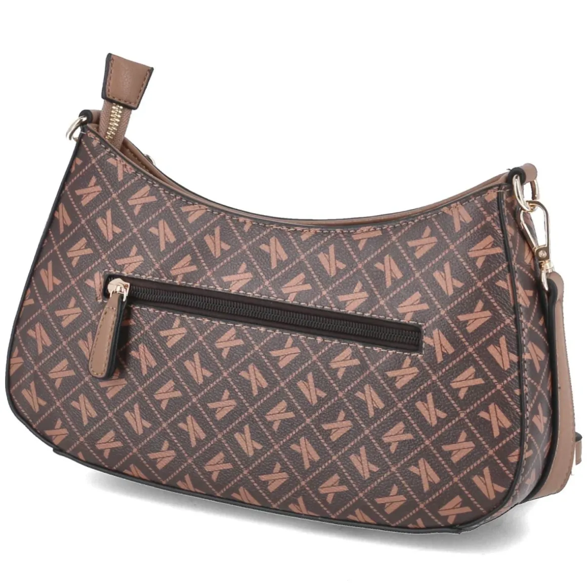 Diese braune Schultertasche setzt mit Allover-Markenprint und golden glänzenden Metallelementen ein souveränes Statement. Das kompakte Format mit ca. 15 x 29 x 6 cm und etwa 2,5 Litern Volumen bietet Platz für Essentials, während der sichere Reißverschluss alles zuverlässig schützt. Ein verstärkter Boden sorgt für formstabilen Stand. Praktisch: hinten ein RV-Fach für schnellen Zugriff, innen ein Steckfach und ein weiteres RV-Fach für strukturierte Ordnung. Der lange, verstellbare Gurt mit ca. 130 cm ermöglicht den Crossbody-Tragekomfort, der kurze Riemen mit ca. 50 cm die elegante Hand- oder Schultervariante. Modetipp: Den warmen Braunton mit Creme, Karamell und Goldschmuck kombinieren, dazu ein taillierter Blazer und schmale Denim – so entsteht müheloser City-Chic mit grafischem Print-Fokus.