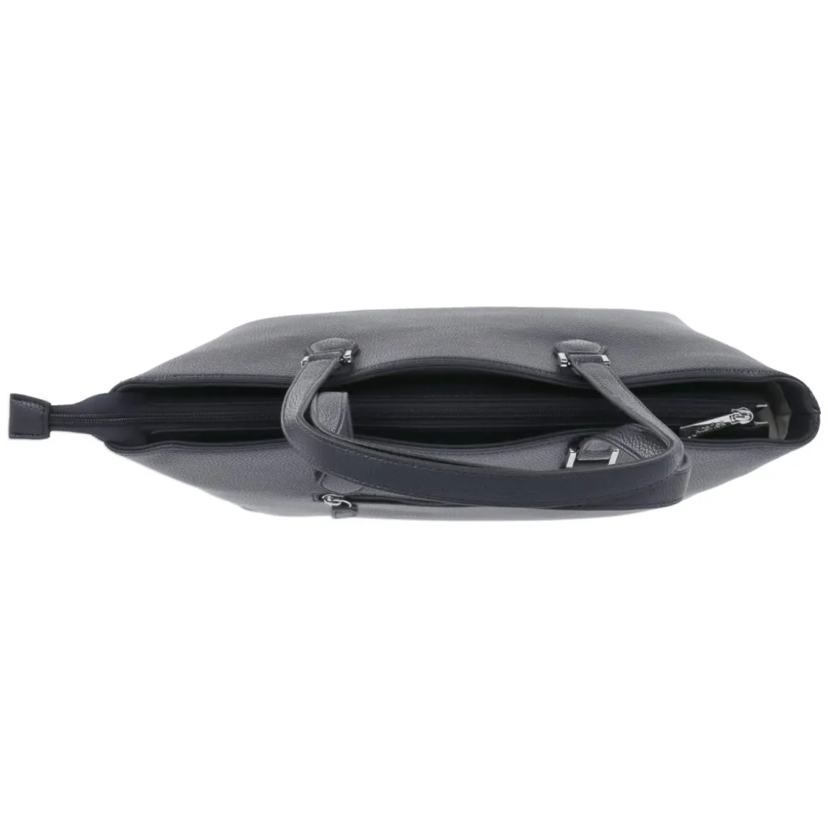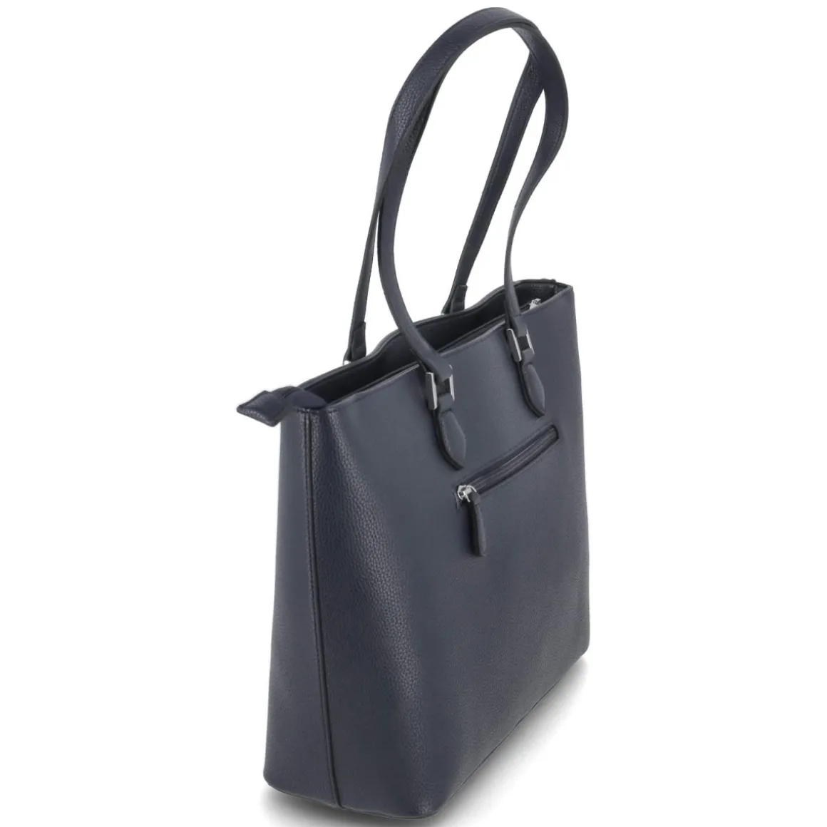 Dieser Shopper in klarem Blau vereint feminine Eleganz mit durchdachter Funktion. Das Format von ca. 28 x 32 x 12 cm fasst rund 10 Liter und bleibt dank verstärktem Boden mit Metallfüßchen formstabil, selbst bei vollem Inhalt. Zwei feste Henkel von ca. 60 cm Länge liegen angenehm auf der Schulter, während das Frontlogo einen dezenten Akzent setzt. Wertsachen sind im rückseitigen Reißverschlussfach sicher aufgehoben; das Reißverschlusshauptfach öffnet den Blick auf ein strukturiertes Innenleben mit weiterem Reißverschlussfach, Schlüsselband mit Karabiner, zwei Steckfächern und zwei Stiftplätzen. So bleibt alles schnell griffbereit und ordentlich. Die hochwertige Verarbeitung und der zuverlässige Reißverschluss machen das Modell zum täglichen Favoriten vom Büro bis zum Wochenendbummel. Modetipp: Mit Ringelshirt, hellem Trench und Loafern entsteht ein souveräner City-Look.
