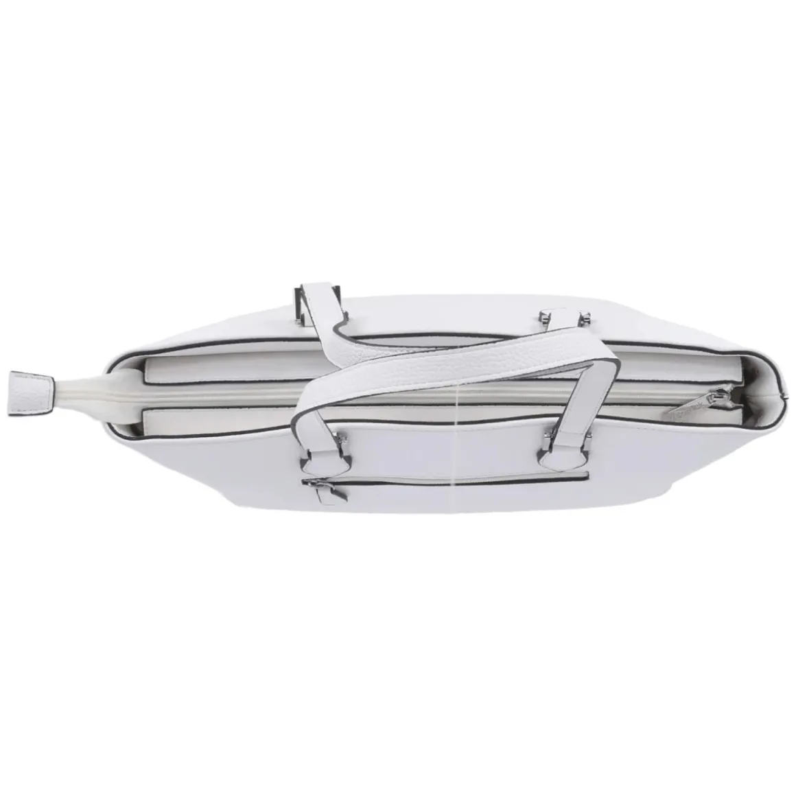 Dieser Shopper in strahlendem Weiß vereint klare Linien mit einer klug strukturierten Innenaufteilung. Mit ca. 28 x 32 x 12 cm und etwa 10 Litern Volumen begleitet die Handtasche mühelos durch Büro, Stadtbummel und Abendprogramm. Ein Reißverschlusshauptfach schützt Inhalte zuverlässig, hinten bietet ein weiteres Reißverschlussfach schnellen Zugriff auf Essentials. Innen sorgen ein Reißverschlussfach, zwei Steckfächer und zwei Stiftplätze für Übersicht, das Schlüsselband mit Karabiner hält den Schlüsselbund sicher an Ort und Stelle. Feste Henkel von ca. 60 cm tragen angenehm über Schulter oder Arm, der verstärkte Boden mit Metallfüßchen bewahrt die Form und schont Oberflächen. Das weiße Finish bringt frische Eleganz in sportliche und formelle Looks. Modetipp: Zu monochromen Outfits in Creme und Taupe kombinieren, dazu zarte Gold-Details für einen modernen Ton-in-Ton-Effekt.