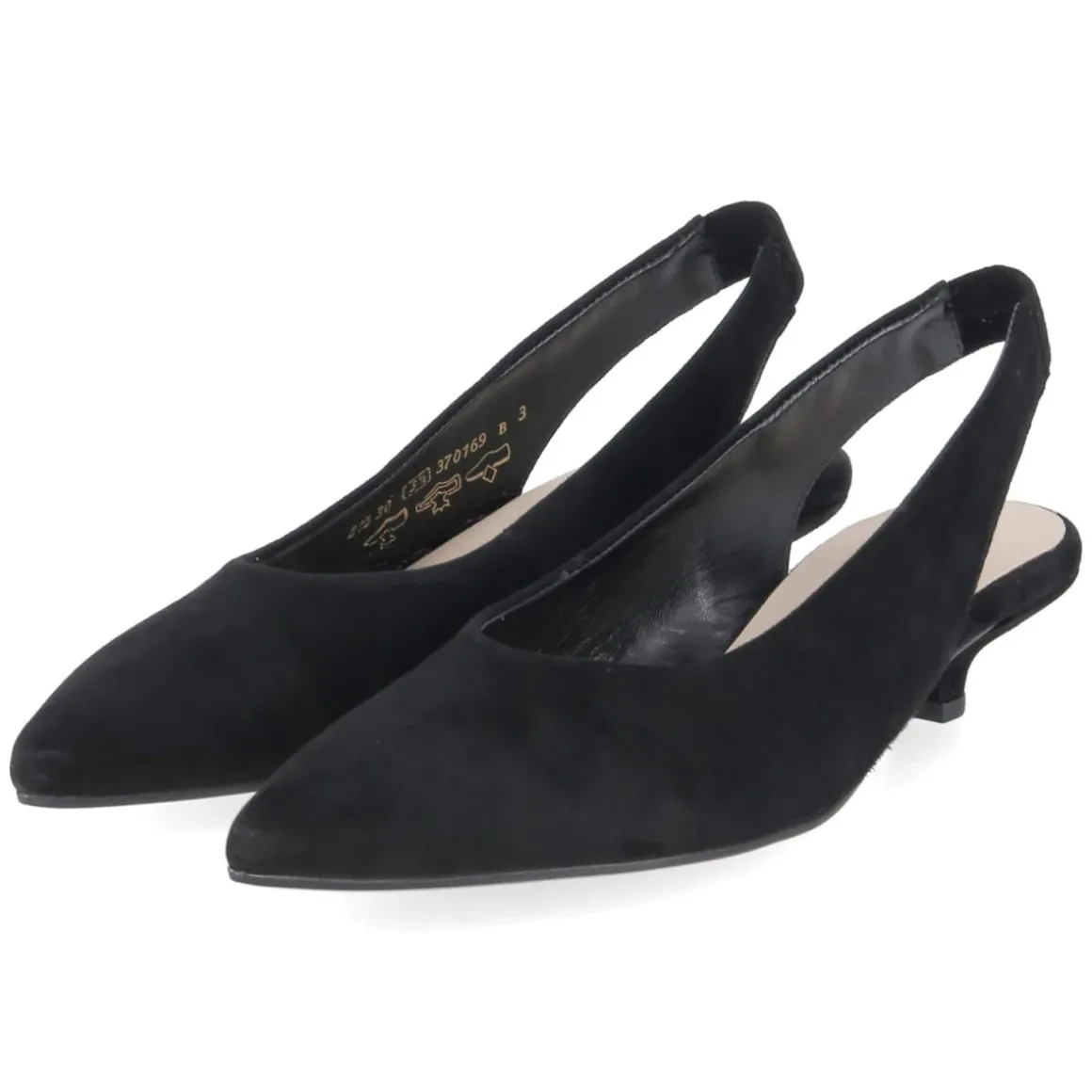 Die Gabor Slingpumps verbinden zeitlose Eleganz mit komfortabler Alltagstauglichkeit. Schwarzes Rauleder mit samtiger Oberfläche und spitz zulaufender Silhouette verleiht jedem Look eine präzise Linie. Der 3,5 cm hohe Trichterabsatz im Stil zarter Kitten Heels streckt subtil und bleibt den ganzen Tag lang angenehm. Dank elastischem Einstieg gelingt das Hineinschlüpfen mühelos, der Verschluss entfällt. Ein weich gepolstertes Fußbett und die flexible Laufsohle sorgen gemeinsam mit der atmungsaktiven Decksohle aus Leder für sanften Auftritt und ein ausgewogenes Tragegefühl. Die Passform fällt normal aus und begleitet verlässlich vom Office bis zum Abend. Modetipp: Für einen modernen Monochrom-Look zu schmaler Zigarettenhose, feiner Satinbluse und kurzem Blazer kombinieren; dazu minimalistischer Schmuck betont die klare Form.