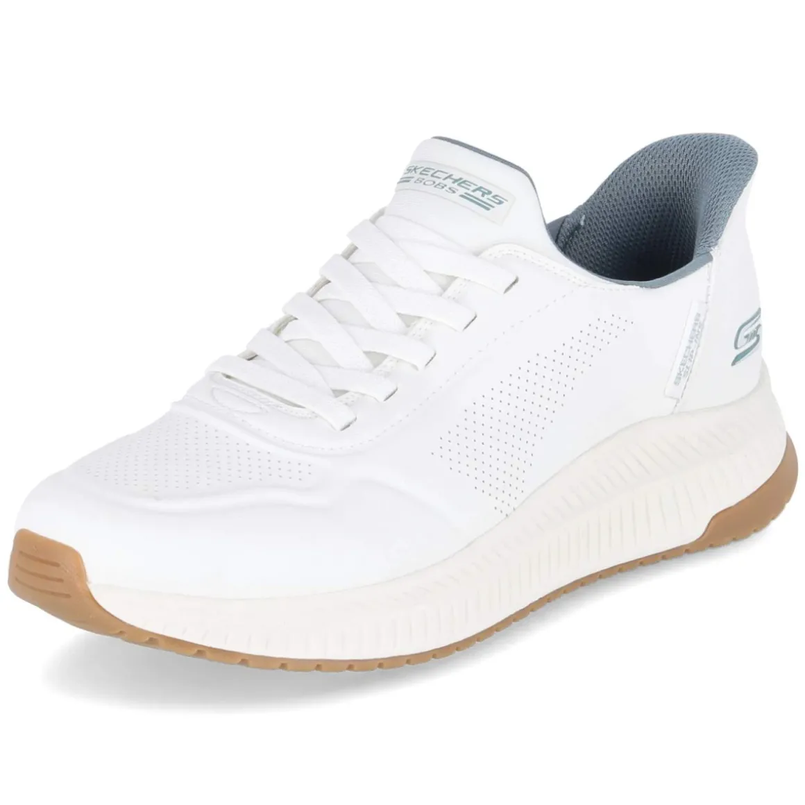 Der Skechers Slip-Ins BOBS SPORT SQUAD vereint sportliche Dynamik und unkomplizierten Komfort in einem cleanen, weißen Herren-Sneaker. Das synthetische Obermaterial zeigt eine pflegeleichte Oberfläche mit dynamischen Prägungen und feinen Lochungen, die der modernen Optik Struktur und leichte Luftigkeit verleihen. Dank ohne Verschluss gelingt der Einstieg besonders einfach; ein integriertes Elastikband unterstützt einen flexiblen, sicheren Sitz. Die beste Memory-Foam-Fußbettung federt jeden Schritt weich ab, während die textile Decksohle angenehm am Fuß liegt. Eine verstärkte Ferse stabilisiert die Passform, die flexible, rutschfeste Laufsohle gibt zuverlässigen Halt im urbanen Alltag. Mit runder Vorderkappe und normaler Passform zeigt sich das Modell vielseitig kombinierbar – vom Büro bis zum Wochenend-Look. Modetipp: Besonders wirkungsvoll zu einer schmalen hellen Chino, cleanen weißen Socken und einem minimalistischen Overshirt in Ecru oder Grau.