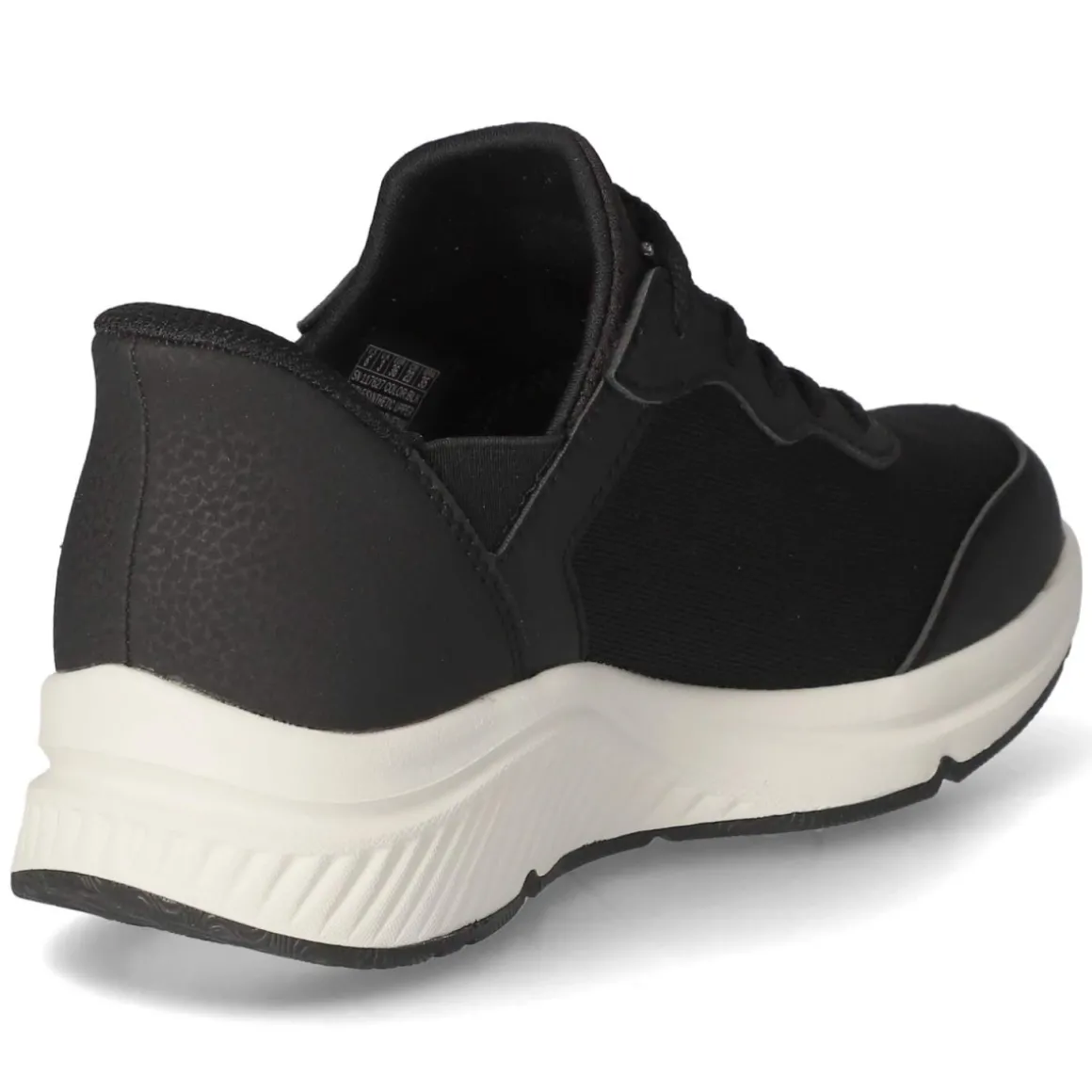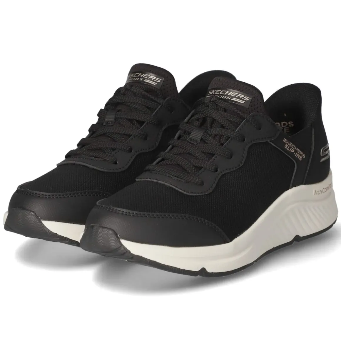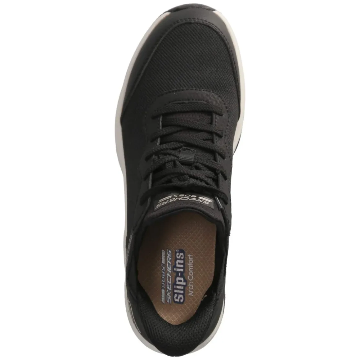 Der Slip Ins Sneaker A LOOK von Skechers verbindet sportliche Funktion und urbanen Stil. Das schwarze Obermaterial aus Textil und Synthetik wird von atmungsaktiven Mesh-Partien und bronzefarbenen Markendetails akzentuiert. Dank unkompliziertem Einstieg mit zwei Elastikeinsätzen und klassischer Schnürung sitzt der Schuh sicher, während die gepolsterte Ferse und das weiche, textile Fußbett langanhaltenden Komfort bieten. Runde Schuhspitze sowie verstärkter Zehen- und Fersenbereich erhöhen die Alltagstauglichkeit, die flexible, rutschhemmende Laufsohle sorgt für verlässlichen Grip. Die Passform fällt normal aus. Das Modell ist aus veganen Materialien gefertigt. Modetipp: Besonders harmonisch wirkt der Sneaker zu Cropped-Jeans und einem kastenförmigen Blazer; Accessoires in warmen Metallic-Tönen greifen die Bronzedetails elegant auf.