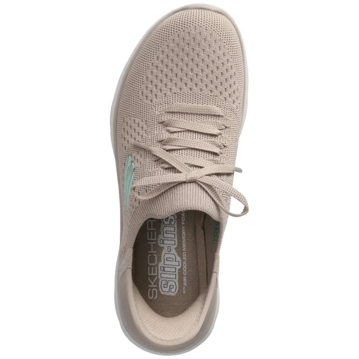 Der Skechers Slip-Ins Sneaker NEW DAILY vereint unkomplizierten Komfort mit einem femininen Twist. Das textile Obermaterial in vielseitigem Taupe wirkt leicht und atmungsaktiv, die runde Schuhspitze und die gepolsterte Ferse sorgen zusammen mit dem weichen, gepolsterten Fußbett für langanhaltendes Wohlgefühl. Durch den elastischen Einstieg gelingt der Slip-on-Komfort ohne Verschluss im Handumdrehen. Die flexible, rutschhemmende Laufsohle bietet verlässlichen Halt im Alltag, während das reflektierende Markenlogo subtile Akzente setzt. Eine zarte Zierschleife ergänzt das cleane Design. In der Maschine waschbar und aus veganen Materialien gefertigt, präsentiert sich der Schuh als pflegeleichter Begleiter. Fällt normal aus und eignet sich für Büro, Stadtbummel oder Reise. Modetipp: Mit Cropped-Jeans, Feinstrick und leichtem Trench entsteht ein zeitloser Look, der auch zu fließenden Midikleidern harmoniert.