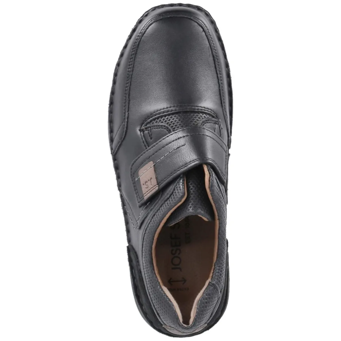 Der Slipper NEW ANVERS 83 von Josef Seibel verbindet klassische Eleganz mit funktionalem Komfort. Schwarzes Glattleder, klassische Ziernähte und eine runde Vorderpartie schaffen eine zeitlose Silhouette. Das hautfreundliche Lederfutter und der leicht gepolsterte Einstiegsbereich sorgen für angenehmes Tragegefühl, während verstärkte Zehen- und Fersenbereiche zusätzliche Stabilität geben. Der bequeme Klettverschluss mit Elastikeinsatz ermöglicht eine präzise Anpassung. Das herausnehmbare Lederfußbett erlaubt den Einsatz eigener Einlagen, die flexible Laufsohle mit leichtem Profil unterstützt ein natürliches Abrollen. Die Passform fällt normal aus und eignet sich für den täglichen Einsatz zwischen Büro und Freizeit. Modetipp: Mit anthrazitfarbenen Chinos und feinem Strickpoloshirt entsteht ein smart-casual Look, der Souveränität ausstrahlt.