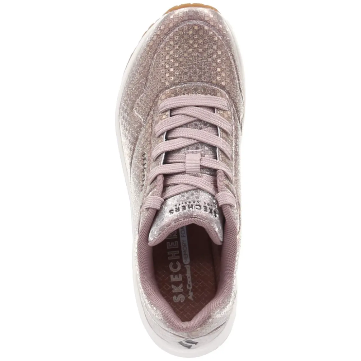 Der Skechers UNO- DISCO NITE setzt ein strahlendes Statement in Gold und vereint glamouröses Design mit wohltuendem Tragekomfort. Das Obermaterial aus Synthetik zeigt dynamische Prägungen und roségoldene Akzente, die dem Sneaker eine edle Tiefe verleihen. Eine runde Schuhspitze und der klassische Schnürverschluss sorgen für eine zeitlose, sportliche Silhouette. Das Beste: Die weiche Memory-Foam-Fußbettung polstert jeden Schritt, während ein gepolsterter Einstieg sowie verstärkte Zehen- und Fersenbereiche zuverlässigen Halt bieten. Die rutschhemmende Profilsohle mit Sichtfenster in der Ferse sorgt für Grip und einen markanten Look. Pflegeleichte Oberfläche und normal ausfallende Passform erleichtern den Alltag. Modetipp: In Kombination mit dunkel gewaschener Denim und einem seidigen Creme-Blazer entsteht ein lässiger Glam-Mix, der tagsüber ebenso wirkt wie abends.