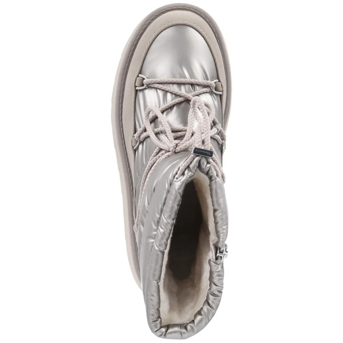 Die Tamaris Snowboots bringen Retrodesign mit metallischem Glanz in den Winteralltag. Das silberne Finish mit leichtem Goldstich und der 4,5 cm Plateau-Absatz setzen ein markantes Statement, während der rund gearbeitete Vorderfuß und der verstärkte Fußrahmen sicheren Halt bieten. Aus veganen Materialien gefertigt, mit wasserabweisendem Synthetik-Obermaterial, warmem Futter und herausnehmbarer, textiler Decksohle entsteht komfortabler Schutz bei Kälte und Matsch. Der bequeme Reißverschlußeinstieg und der Kordelzug am Schaft (ca. 17 cm Höhe, ca. 30 cm Umfang) erleichtern das Anziehen und die Anpassung. Das Memory-Foam-Fußbett passt sich weich an, die rutschfeste Profilsohle sorgt für Traktion. Fällt normal aus und punktet mit Alltagstauglichkeit. Modetipp: Zu wattierter Steppjacke und Strickleggings kombinieren, dazu eine Mütze in Metallic-Nuance für einen harmonischen Winter-Look.