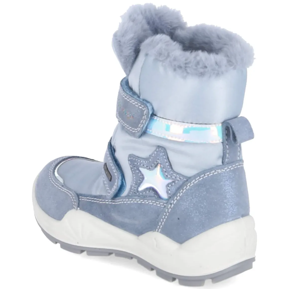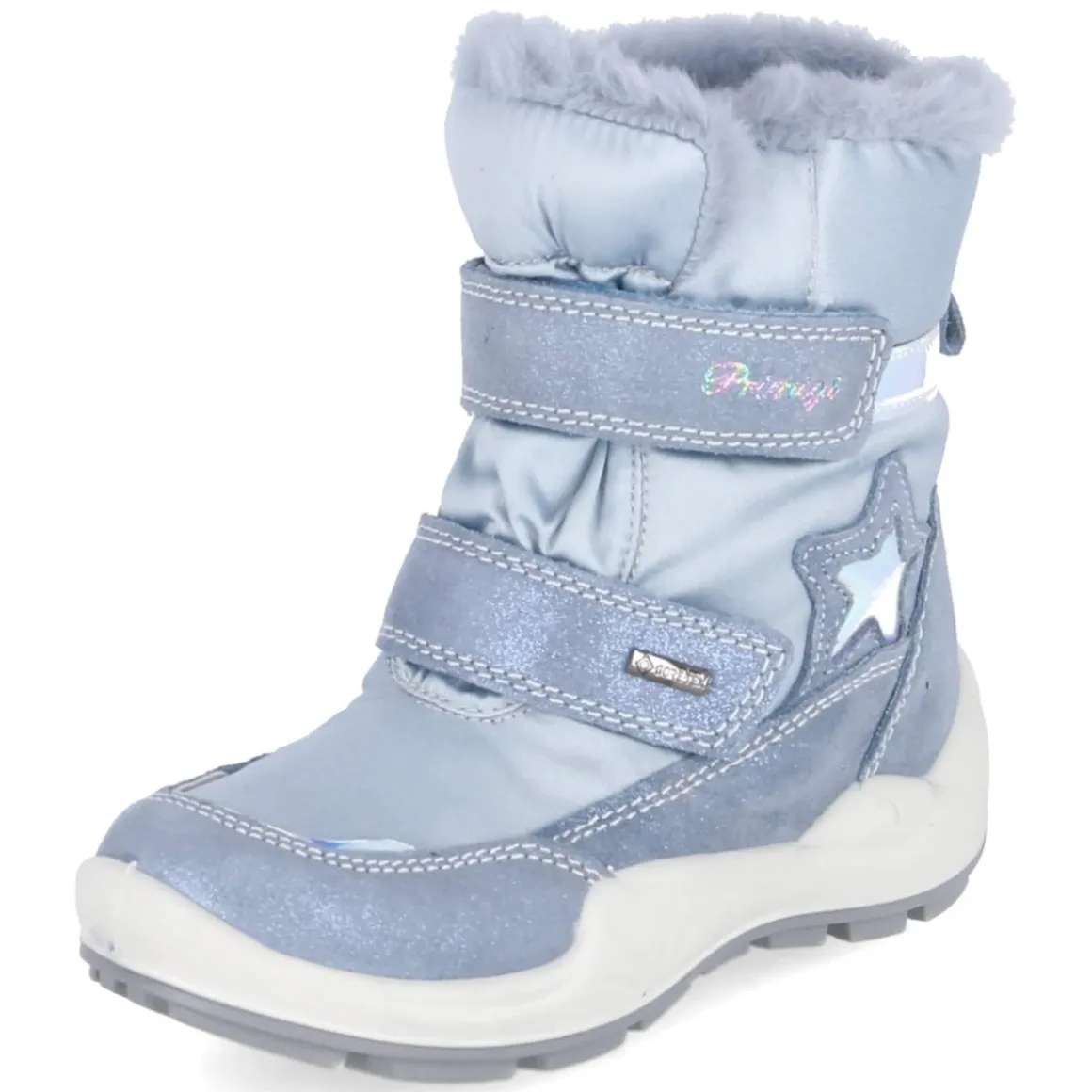 Die blauen Snowboots von Primigi verbinden kindgerechten Komfort mit verlässlichem Wetterschutz. Obermaterial aus Leder und Textil umschließt dank verstärkter Zehen- und Fersenzonen sicher den Fuß, während die runde Spitze Bewegungsfreiheit lässt. Eine Gore-Tex Membran hält zuverlässig wasserfest und atmungsaktiv, ideal für nasse Wintertage. Warmfutter und gepolsterter Einstieg mit Kunstfellkragen sorgen für kuschelige Wärme, die flexible, rutschhemmende Profilsohle bietet Halt auf glatten Wegen. Praktische Klettverschlüsse erleichtern das An- und Ausziehen im Alltag. Herausnehmbare, textile Decksohle und Wechselfußbett unterstützen individuelle Passformen; laut Größenhinweis fällt das Modell normal aus. Metallisch glänzende Highlights setzen einen frischen Akzent zum winterlichen Blau. Modetipp: Perfekt zu Thermojeans, gesteppter Pufferjacke in Navy und einer Strickmütze mit Bommel in Silbergrau.