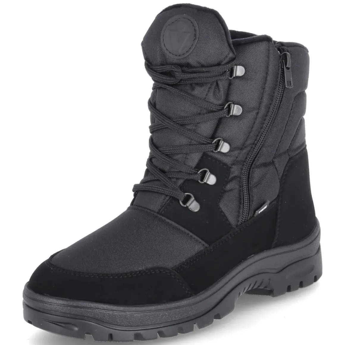 Der Vista Snowboot für Herren setzt auf zuverlässige Performance im Winter. Schwarzes Textil-Obermaterial mit wasserfester Ausrüstung und wasserabweisenden Eigenschaften hält Nässe wirkungsvoll fern, während die atmungsaktive Konstruktion für angenehmes Fußklima sorgt. Das warme Futter umschließt den Fuß weich, unterstützt von gepolstertem Schaft und Textildecksohle. Für sicheren Tritt sorgen die robuste, rutschhemmende Profillaufsohle und das OC-System mit ausklappbaren Spikes, das bei Glätte souveränen Grip liefert. Ein verstärkter Fußrahmen stabilisiert, die Kombination aus Schnürung und bequemem Reißverschluss-Einstieg erleichtert das An- und Ausziehen. Die runde Spitze bietet Zehenfreiheit, die Passform fällt normal aus. Modetipp: In Kombination mit einer technischen Winterjacke und dunklen Cargohosen entsteht ein funktionaler Look, der mit grob gestrickter Beanie stilvoll abgerundet wird.