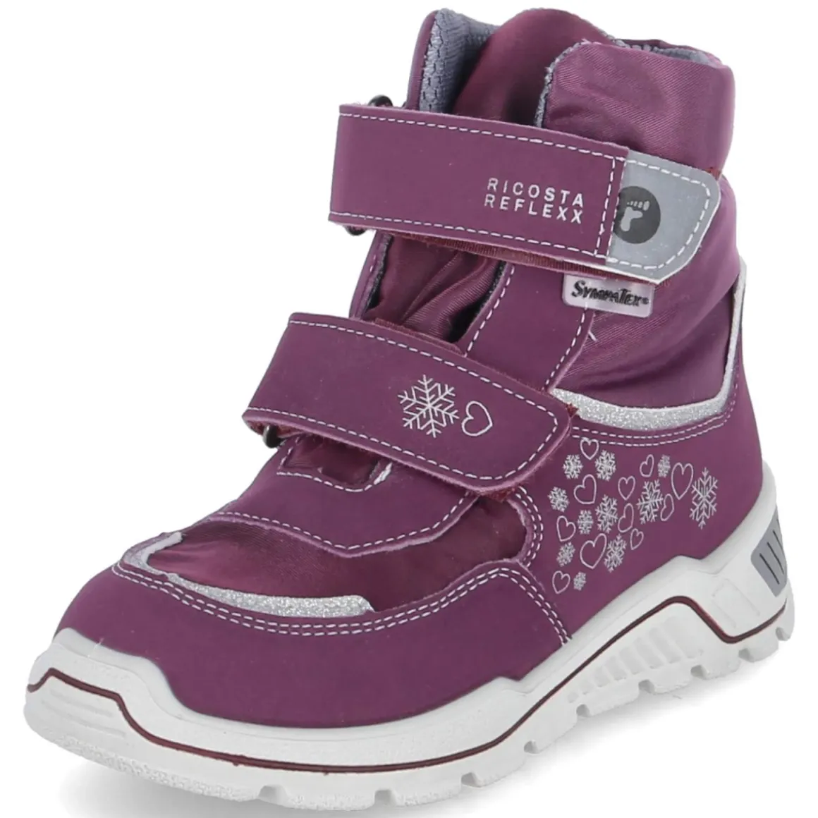 Die Ricosta Snowboots XENA begleiten Kinder trocken und warm durch Wintertage. Das lilafarbene Obermaterial aus Textil und Synthetik wird von einer SympaTex-Membran ergänzt, die zuverlässig wasserfest und atmungsaktiv ist. Warmes Textilfutter und eine textile Decksohle sorgen für kuschelige Geborgenheit, während das herausnehmbare Fußbett das Trocknen und Anpassen erleichtert. Reflektierende Elemente erhöhen die Sichtbarkeit, der verstärkte Fersen- und Zehenbereich schützt im Alltag. Praktische Klettverschlüsse ermöglichen einen sicheren Sitz, die rutschhemmende, flexible Profilsohle gibt Halt auf Schnee und Matsch. Mit runder Schuhspitze und normal ausfallender Passform eignet sich XENA für verschiedenste Aktivitäten. Der silberne Schneeflocken- und Herzprint setzt einen verspielten Akzent. Modetipp: Mit Thermo-Leggings, Steppjacke und Strickmütze in Grau- oder Silbertönen harmoniert das Lila besonders schön.