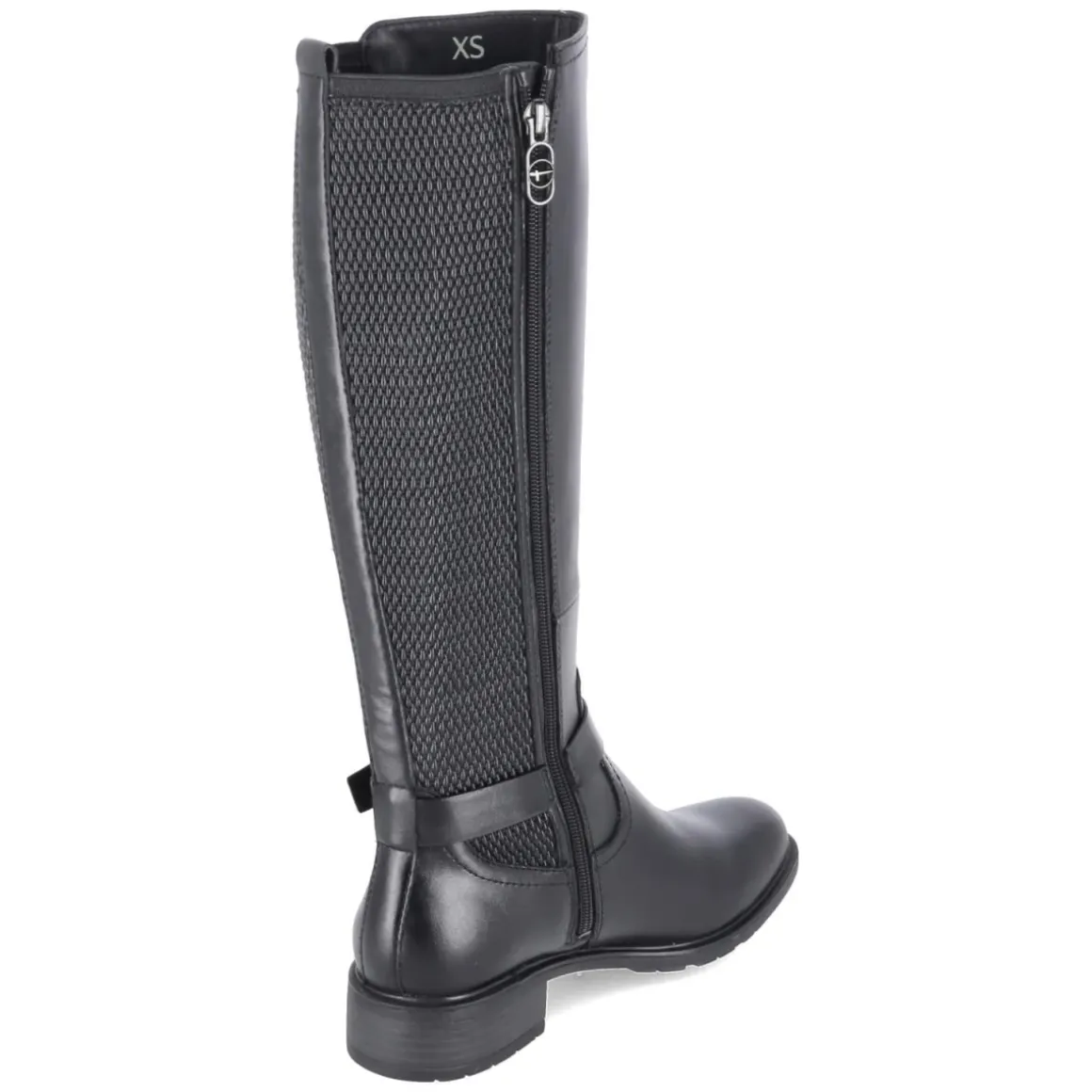 Dieser schwarze Tamaris Stiefel kombiniert einen modernen Material-Mix aus Leder und Synthetik mit alltagstauglichem Komfort. Der runde Leisten und der stabile Blockabsatz mit 3,5 cm Höhe sorgen für ein entspanntes Laufgefühl, unterstützt vom gepolsterten Fußbett und der textilen Decksohle. Ein praktischer Reißverschluss erleichtert das Anziehen, zusätzlich hilft die Anziehlasche. Der Schaft misst ca. 38 cm in der Höhe bei ca. 34 cm Umfang; zwei große Elastikeinsätze in Flechtoptik am hinteren Schaft geben Flexibilität und passen sich dem Bein an. Die flexible, rutschfeste Laufsohle und der Knöchelriemen mit Logo runden das Design ab. Fällt normal aus und bietet vielfältige Kombinationsmöglichkeiten für Damen. Modetipp: Zu Strickkleid und Mantel entsteht ein femininer Look, mit Skinny-Jeans und Oversize-Pullover wirkt der Stiefel urban und lässig.