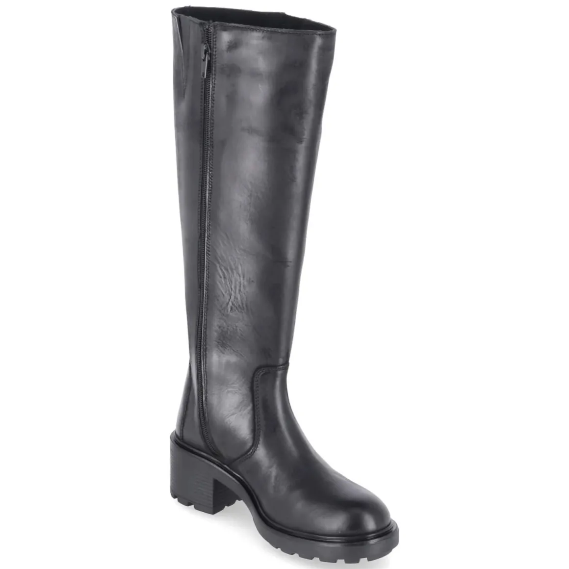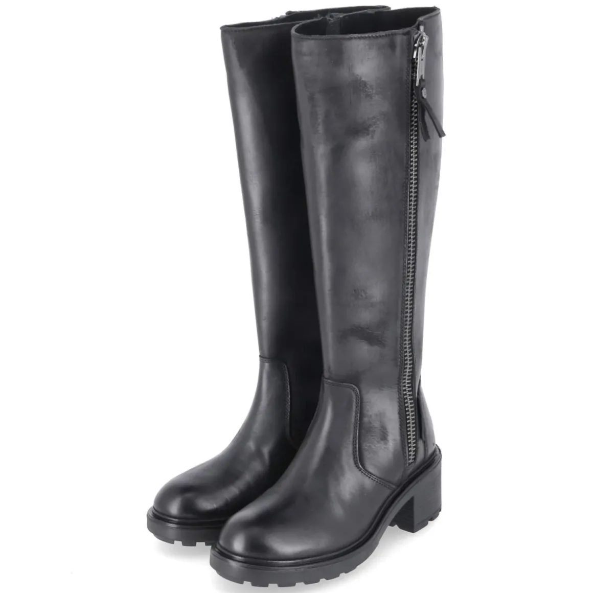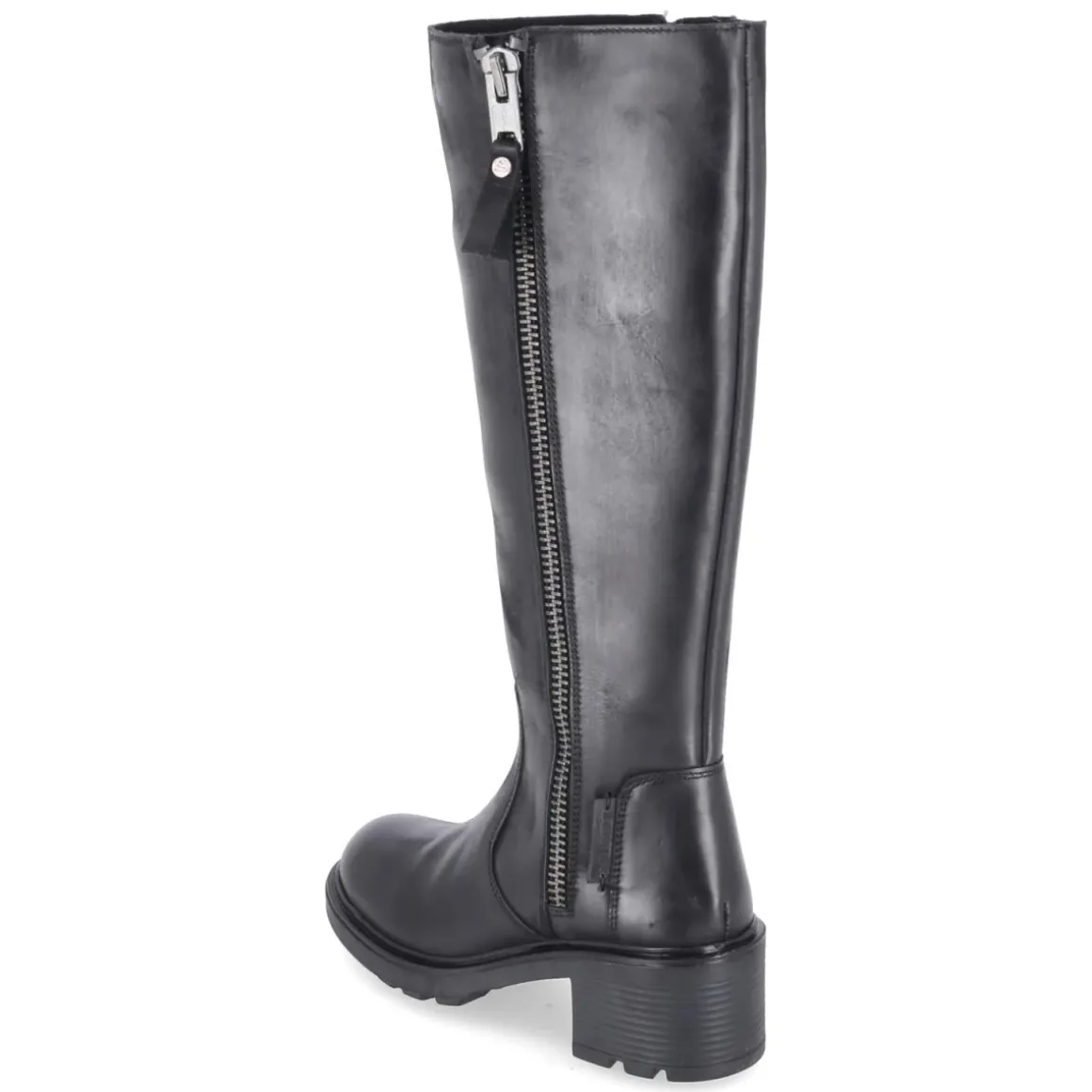 Der schwarze Damen-Stiefel von Bullboxer setzt auf klare Linien und langlebiges Echtleder mit edler Glattleder-Struktur. Der rund geformte Leisten und der 6 cm hohe Blockabsatz sorgen für eine harmonische Silhouette und zuverlässigen Halt im Alltag. Ein bequemer Reißverschlusseinstieg erleichtert das Anziehen, unterstützt von einem kleinen Elastikeinsatz am oberen Schaft, während ein außenliegender Zierreißverschluss dem Design eine markante Note verleiht. Die rutschfeste Profilsohle gibt Sicherheit auf glatten Böden, die verstärkte Ferse und das gepolsterte Fußbett erhöhen den Tragekomfort. Schafthöhe ca. 37 cm, Schaftumfang ca. 40 cm; die Passform fällt schmaler aus. Eine synthetische Decksohle rundet die Ausstattung pflegeleicht ab. Modetipp: Zu Midikleid und Oversize-Blazer entsteht ein moderner City-Look mit ausbalancierter Feminität und Bodenhaftung.