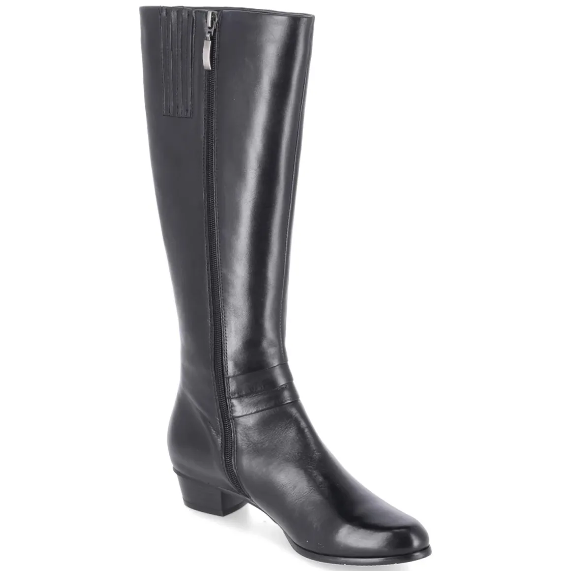Der Damenstiefel von Kaerlek verkörpert zeitlose Eleganz und angenehmen Tragekomfort. Glattes, langlebiges Echtleder prägt die klare Linienführung, während dezente Falten über dem Spann und an der äußeren Ferse dem Design eine raffinierte Note verleihen. Der 3,5 cm hohe Blockabsatz sorgt für stabilen Halt im Alltag, die runde Schuhspitze wirkt klassisch und bietet Zehenfreiheit. Ein Reißverschluss erleichtert den Einstieg, unterstützt vom Stretcheinsatz am oberen Schaft, der sich dem Bein anschmiegt. Das leichte Futter wärmt an kühlen Tagen, die textile Decksohle und ein leicht gepolstertes Fußbett erhöhen den Komfort. Mit einer Schafthöhe von ca. 39 cm und einem Umfang von ca. 38 cm sowie normaler Passform ist eine stimmige Silhouette garantiert. Modetipp: Zu Strickkleid, Wollmantel und blickdichter Strumpfhose entsteht ein eleganter City-Look.