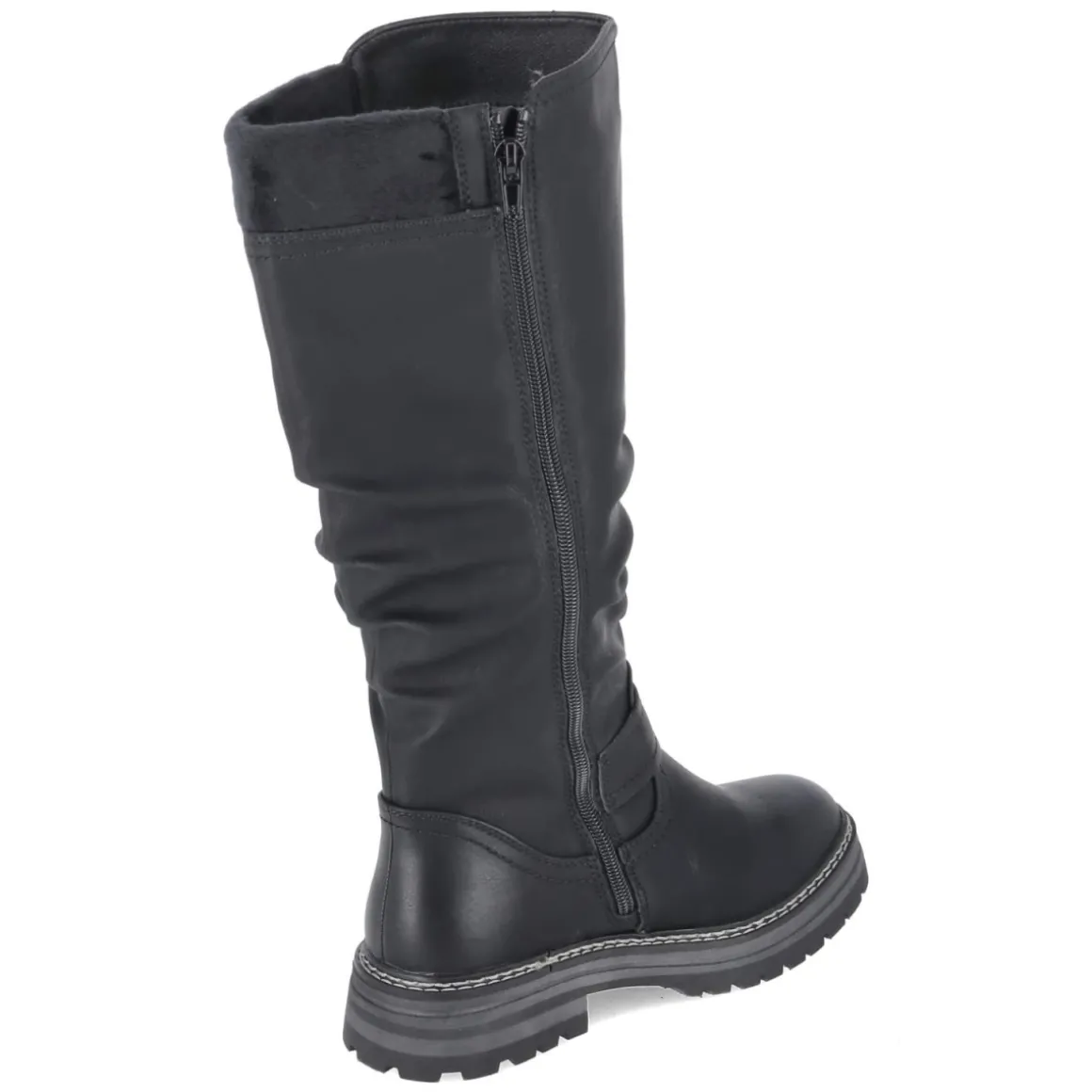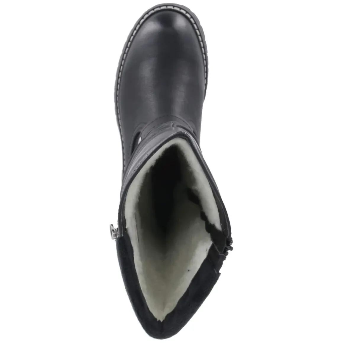 Der schwarze Damen-Stiefel von Rieker verbindet wetterfeste Funktion mit urbaner Eleganz. Das synthetische Obermaterial präsentiert eine moderne Optik, die dank wasserfester, atmungsaktiver Eigenschaften und warmem Futter souverän durch kalte, nasse Tage führt. Mit rund gearbeiteter Schuhspitze, stabilem Blockabsatz von 4 cm und rutschfester Profilsohle entsteht verlässlicher Halt auf winterlichen Wegen. Der Reißverschluss ermöglicht bequemes An- und Ausziehen, während Zierreißverschluss und Riemen am Knöchel dezente Akzente setzen. Der weiche hintere Schaftrand schont den Wadenbereich; bei ca. 34 cm Schafthöhe und rund 40 cm Umfang sitzt das Modell komfortabel. Die textile Decksohle liegt über einem herausnehmbaren Fußbett und unterstützt individuellen Tragekomfort. Größenhinweis: fällt normal aus. Modetipp: zu Strickkleid und dicker Strumpfhose kombinieren.