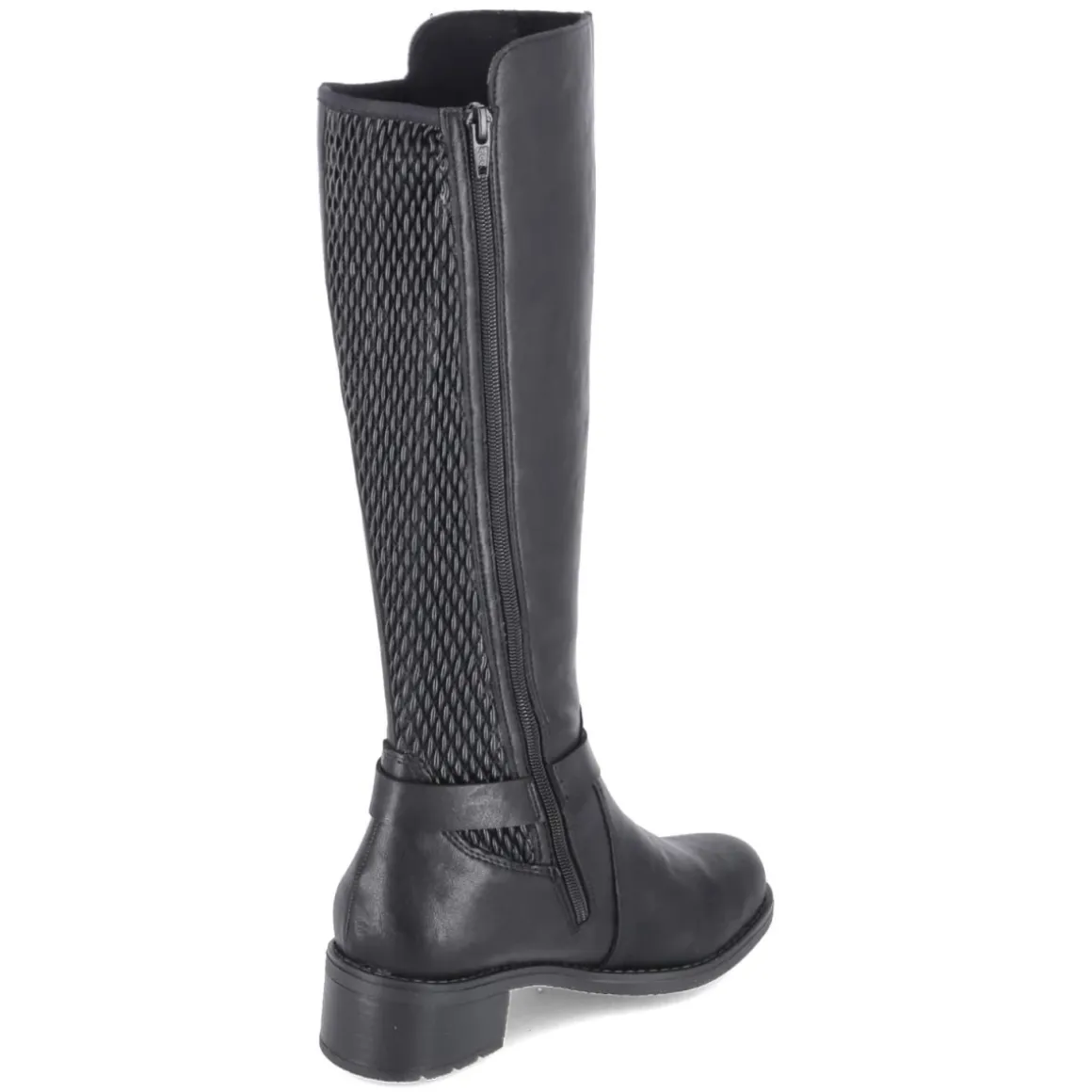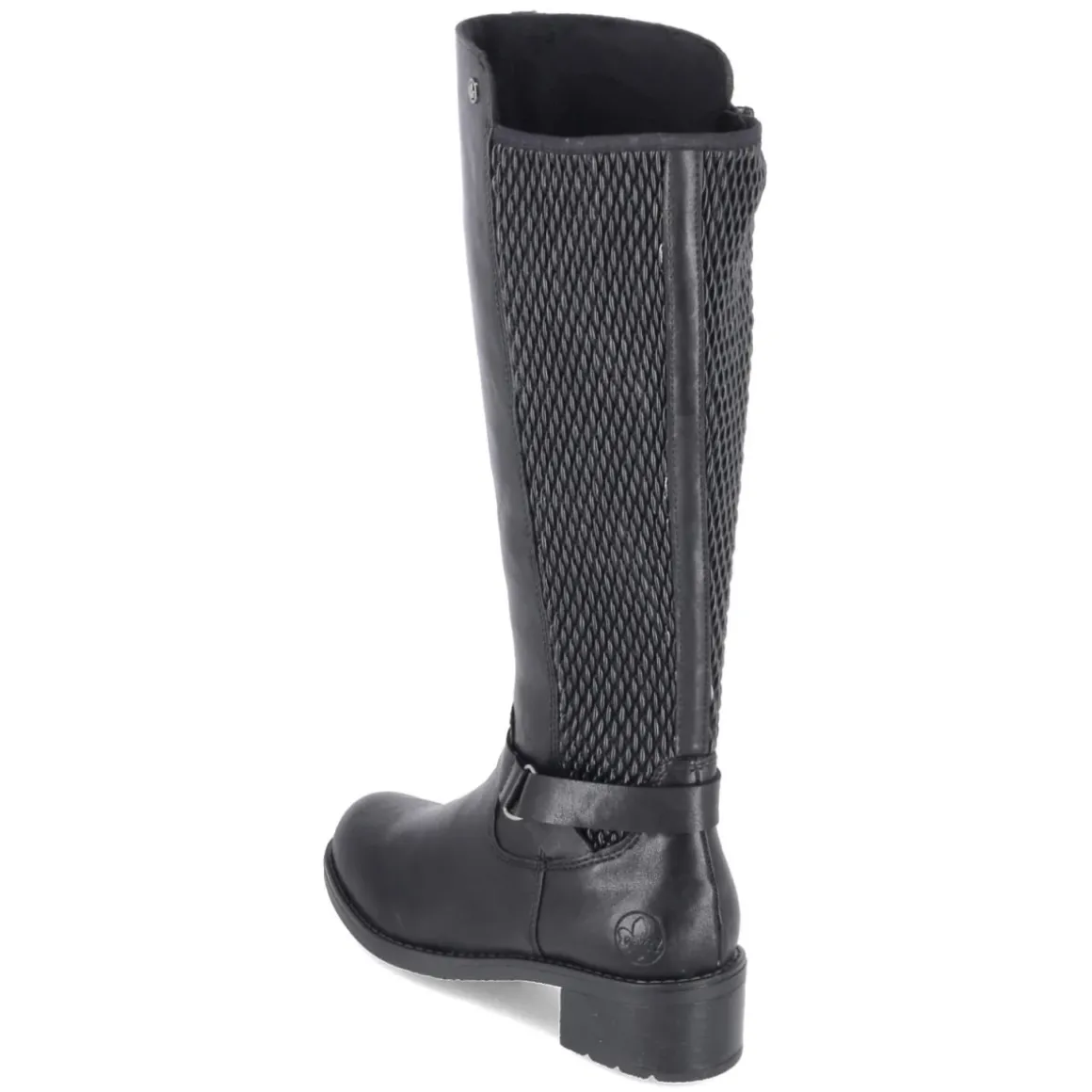 Dieser schwarze Damenstiefel von Rieker verbindet alltagstauglichen Komfort mit eleganter Zurückhaltung. Das pflegeleichte Obermaterial aus Synthetik zeigt sich in zeitloser Optik, während die runde Schuhspitze und der 4,5 cm hohe Blockabsatz für ein harmonisches Silhouette-Update sorgen. Ein bequemer Reißverschlusseinstieg erleichtert das An- und Ausziehen, der Varioschaft mit stretchigem, hinten geflochten wirkendem Einsatz passt sich unterschiedlichen Waden an. Das Schaftmaß liegt bei ca. 35 cm Höhe und 36 cm Umfang. Im Inneren sorgt ein leichtes Fleecefutter für behagliche Wärme, die textile Decksohle und das komfortable Wechselfußbett bieten angenehme Dämpfung. Eine flexible, rutschfeste Laufsohle gibt sicheren Halt, der zierende Knöchelriemen setzt einen dezenten Akzent. Modetipp: Mit Midikleid in Rippstrick und Oversize-Wollmantel entsteht ein lässig-femininer City-Look.