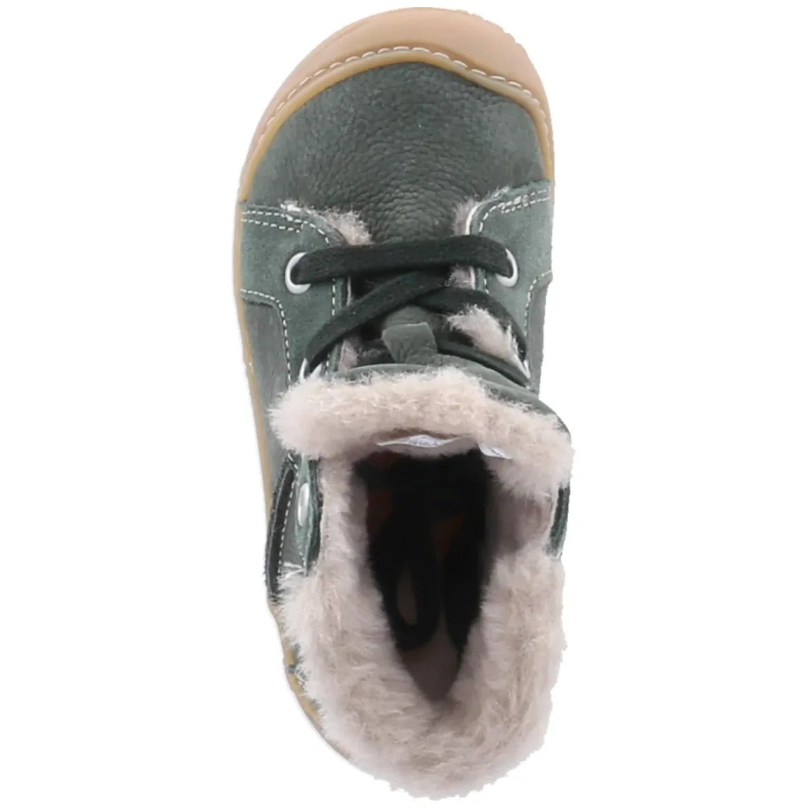 Die Stiefeletten ELIA von Pepino begleiten Kleinkinder zuverlässig durch kalte Tage. Das Obermaterial aus robustem Rauleder in frischem Grün trifft auf ein innen durchgehend verarbeitetes, weiches Lammfellfutter, das kleine Füße angenehm warm hält. Die runde Kappe und die verstärkte Ferse bieten Schutz und Stabilität, während die flexible, rutschhemmende Barefoot-Laufsohle ein natürliches Abrollen fördert. Dank Schnürsenkeln lässt sich der Sitz präzise anpassen; der gepolsterte Einstieg mit Fellkragen schmiegt sich sanft an. Ein Wechselfußbett und eine textile Decksohle erhöhen den Tragekomfort und erleichtern die Pflege. In WMS Weit gefertigt und größengetreu ausfallend, bleibt genug Platz für dicke Socken. Modetipp: Zu Wollmantel, Strickmütze und Cordhose entsteht ein fröhlicher Winterlook, der das Grün schön aufgreift.