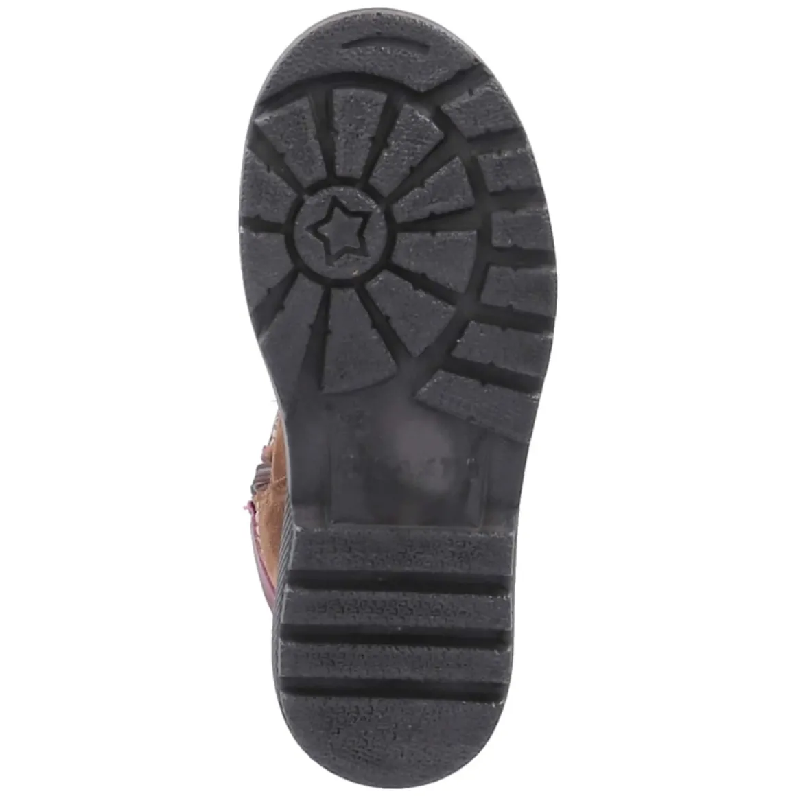 Die Stiefeletten FRIDA von Ricosta vereinen kindgerechten Komfort mit liebevollen Details. Weiches Rauleder in warmem Braun wird durch zwei lila Zierriemen und eine seitliche Pferdeapplikation spielerisch akzentuiert. Ricosta-Tex hält kleine Füße bei Schmuddelwetter zuverlässig trocken, bleibt winddicht und atmungsaktiv. Das leichte, wärmende Textilfutter sorgt an kühlen Tagen für ein ausgeglichenes Fußklima. Ein runder Leisten, der verstärkte Fersenbereich und das herausnehmbare Wechselfußbett unterstützen wachsende Füße, während die flexible, rutschhemmende Laufsohle sicheren Halt gibt. Der praktische Reißverschluss ermöglicht einen bequemen Einstieg und die Passform fällt verlässlich normal aus. Modetipp: Zu Cordrock und Wollstrumpfhose oder zu schmalen Jeans und einem Strickcardigan entsteht ein gemütlicher Herbst-Look mit fröhlichem Farbakzent am Knöchel.