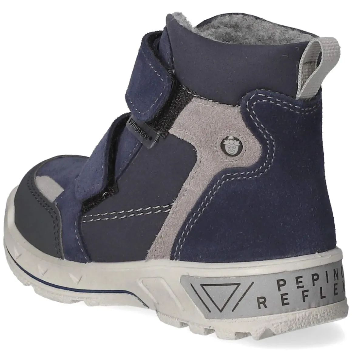 Die Stiefeletten JANNE von Pepino vereinen Schutz und Komfort für aktive Tage. Der robuste Material-Mix aus Leder und Synthetik wird durch eine SYMPATEX-Membran wasserabweisend unterstützt, während warmes Futter für behagliches Klima sorgt. Dank runder Schuhspitze, großzügiger Weite W und komfortablem Wechselfußbett bleibt viel Platz für kleine Zehen. Praktische Klettverschlüsse und eine Anziehlasche erleichtern das An- und Ausziehen, der verstärkte Zehen- und Fersenbereich erhöht die Haltbarkeit im Alltag. Reflektierende Details verbessern die Sichtbarkeit, die flexible, rutschfeste Laufsohle gibt sicheren Halt auf nassem Untergrund. In Dunkelblau gehalten, passt das Modell vielseitig zu Wintergarderoben. Modetipp: Mit wolliger Strumpfhose, Cordrock oder Jeans in gedeckten Tönen und einer gesteppten Jacke kombiniert entsteht ein lässiger Outdoor-Look.