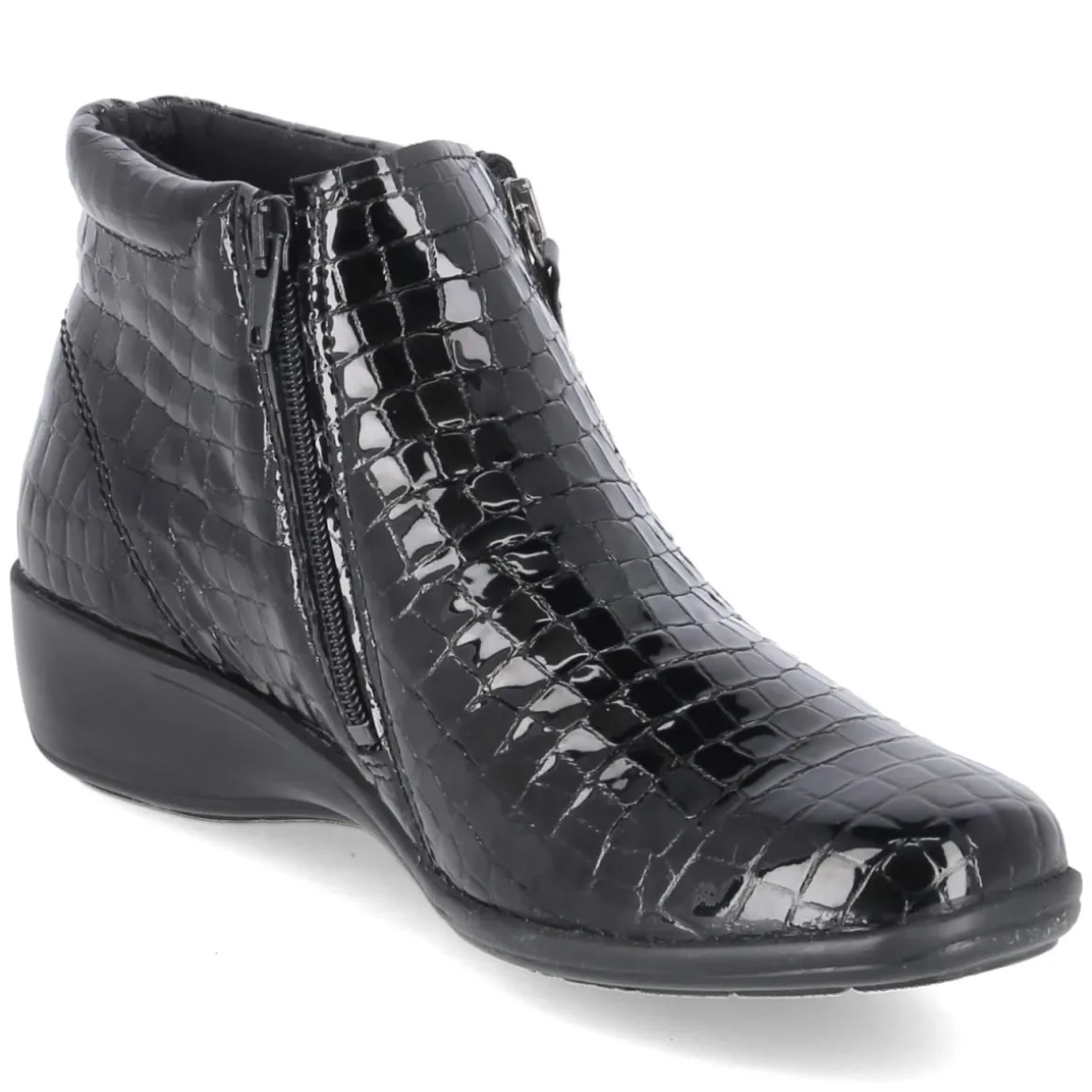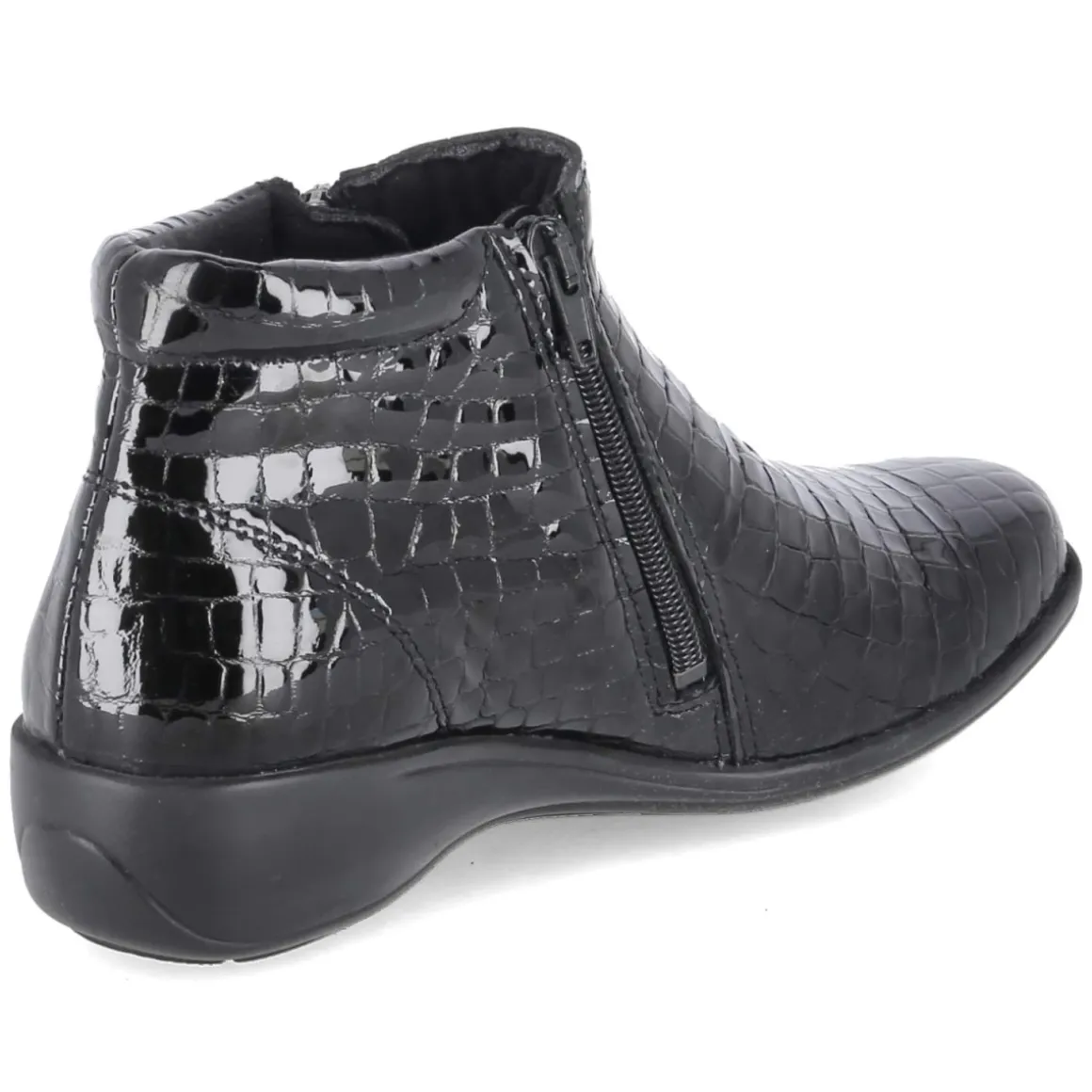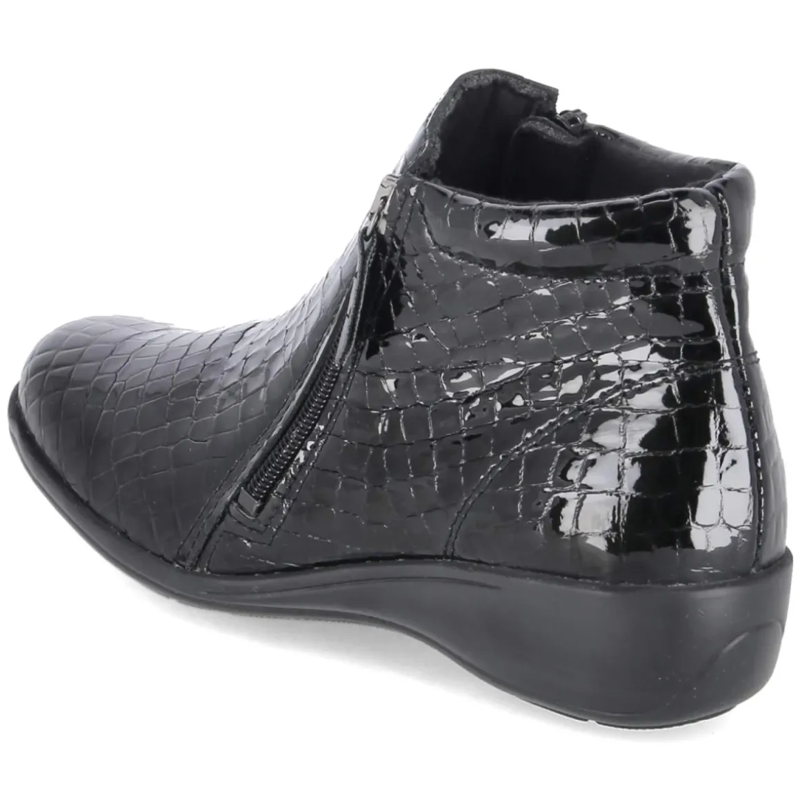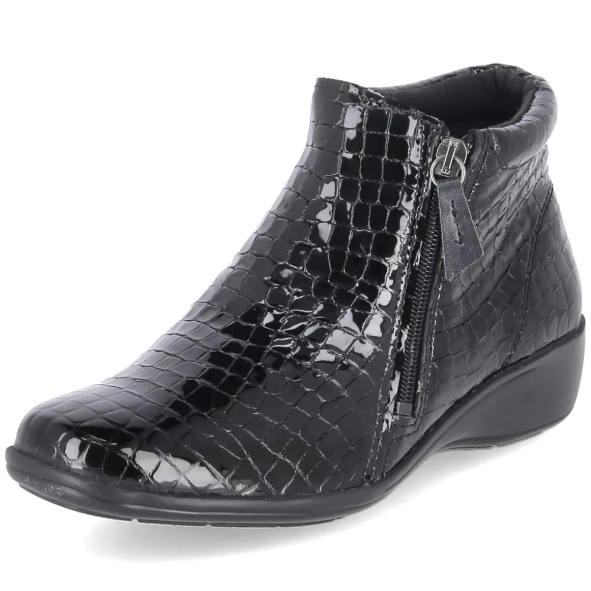 Beliana präsentiert mit den Stiefeletten LEXI 99 einen eleganten Allrounder für Damen, der den urbanen Look mit Komfort verbindet. Das Obermaterial aus schwarzem Lackleder zeigt eine edle Glanzoptik, die durch das dezente Reptilmuster modern akzentuiert wird. Eine runde Schuhspitze und das geringe Gewicht sorgen für angenehmes Tragegefühl im Alltag. Praktische Reißverschlüsse erleichtern den Einstieg, der zusätzlich weich gepolstert ist. Die verstärkte Ferse bietet Stabilität, während die sehr flexible, rutschfeste Laufsohle sicheren Halt gibt. Innen punktet eine textile Decksohle und ein herausnehmbares Wechselfußbett, ideal für eigene Einlagen. Der Schnitt fällt größengetreu aus und richtet sich an Erwachsene, die Wert auf Stil und Funktion legen. Modetipp: Mit schmaler Anzughose in Cropped-Länge und einem feinen Strickrolli entsteht ein cleaner, glänzender City-Look, der tagsüber und abends überzeugt.