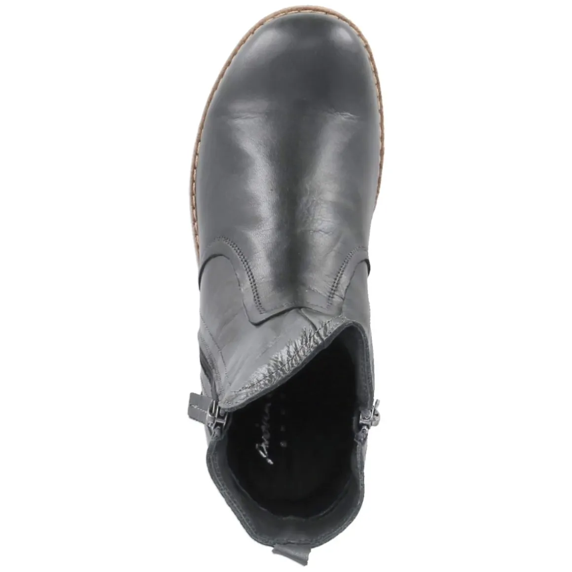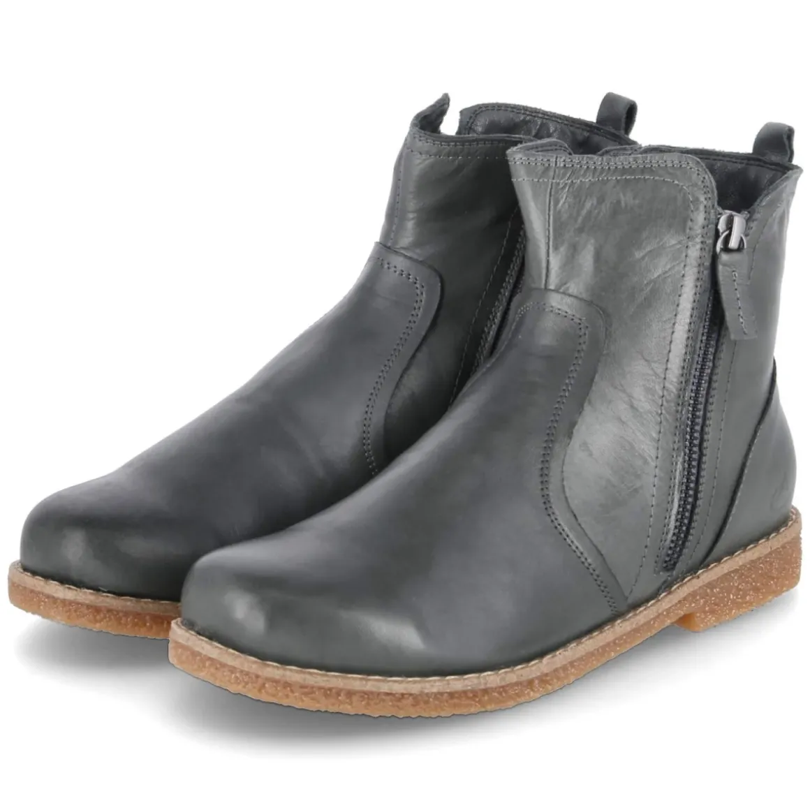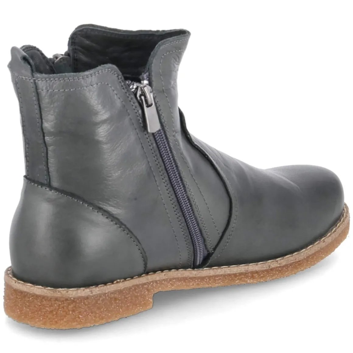 Diese grauen Stiefeletten von Andrea Conti vereinen zeitloses Design mit funktionalem Komfort. Das Obermaterial aus hochwertigem Glattleder zeigt eine feine Struktur und gewinnt mit jedem Tragen an Charakter, während die langlebige Verarbeitung verlässliche Begleitung im Alltag verspricht. Die runde Schuhspitze bietet Zehenfreiheit, die lederne Decksohle sorgt für ein natürliches Fußklima. Dank bequemem Reißverschlußeinstieg gelingt das An- und Ausziehen im Handumdrehen, das komfortable Wechselfußbett kann bei Bedarf durch eigene Einlagen ersetzt oder zum Lüften herausgenommen werden. Der Schnitt fällt normal aus und harmoniert mit einer schlanken Silhouette am Knöchel, wodurch die Proportionen elegant wirken. Die dezente Graunuance lässt sich vielseitig kombinieren, von lässig bis chic. Modetipp: Zu Cropped-Jeans und einem Wollmantel in Camel entsteht ein moderner Kontrast, feine Socken in Ton-in-Ton runden den Look ab.