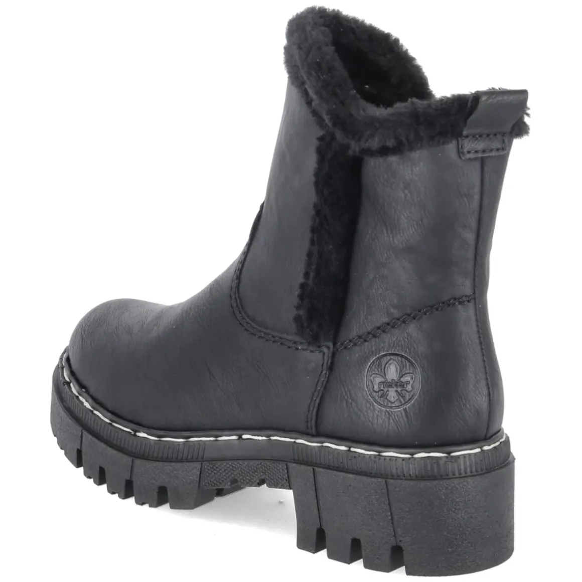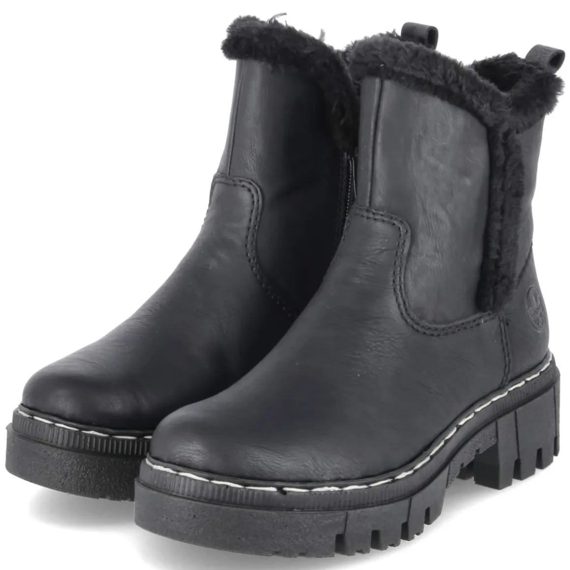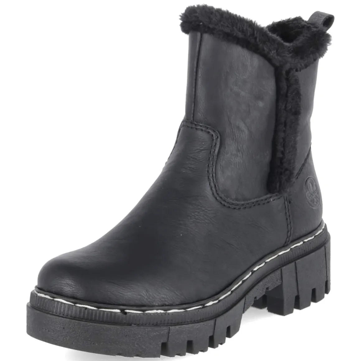 Rieker Stiefeletten für Damen vereinen moderne Optik mit wohliger Wärme. Das schwarze Obermaterial aus Textil und Synthetik zeigt eine pflegeleichte Oberfläche, der Kunstfellkragen setzt einen kuscheligen Akzent. Ein 5 cm hoher Blockabsatz bietet stabilen Stand und streckt zugleich die Silhouette, die runde Schuhspitze sorgt für angenehme Zehenfreiheit. Innen verwöhnt Warmfutter, die weiche Decksohle aus Textil erhöht das Fußwohl bei längeren Wegen. Der seitliche Reißverschluss erleichtert den Einstieg, die rutschfeste Profilsohle gibt Sicherheit auf glatten Untergründen. Die Passform fällt normal aus und macht die Stiefelette zum unkomplizierten Allrounder für Alltag und City. Modetipp: Zu Strickkleid und blickdichter Strumpfhose stylen, dazu ein Wollmantel in Camel für einen zeitlosen, urbanen Look.