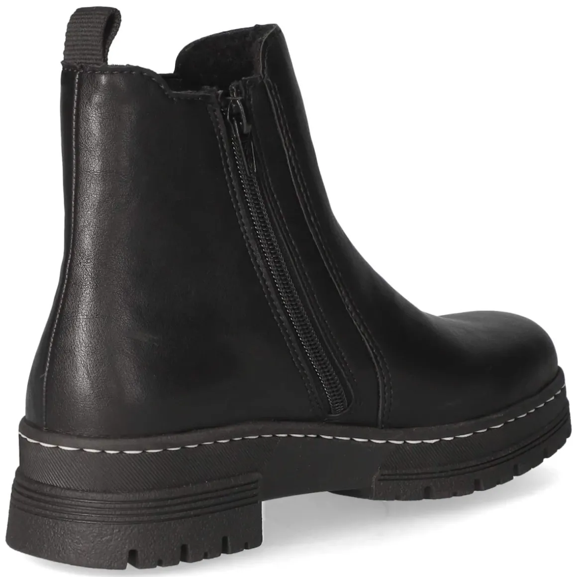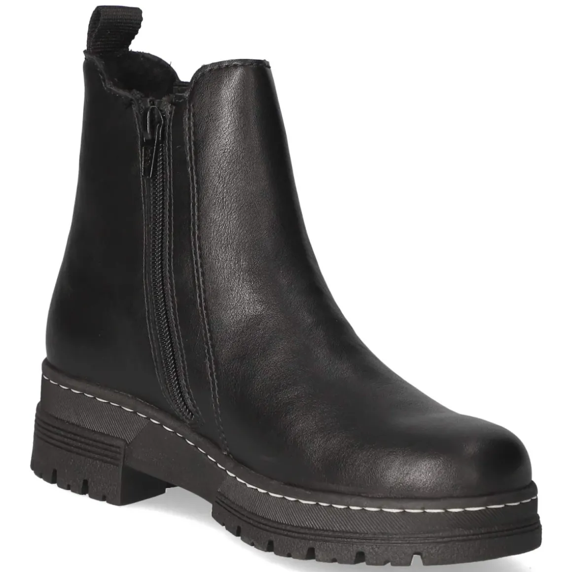 Diese schwarzen Rieker-Stiefeletten verbinden wintertauglichen Komfort mit zeitlosem Design. Das pflegeleichte Kunstleder zeigt eine feine Struktur, betont durch Ziernähte, Markendetails und eine rustikale, weiße Sohlennaht. Die runde Spitze und der 4-cm-Blockabsatz geben dem Fuß natürliche Freiheit und stabilen Halt. Innen sorgt Warmfutter für behagliche Temperaturen, während das gepolsterte Wechselfußbett und die flexible, rutschhemmende Laufsohle für langanhaltenden Gehkomfort stehen. Reißverschluss und Anziehlasche erleichtern den Einstieg, der Elastikeinsatz am Schaft optimiert den Sitz. Die Passform fällt normal aus und macht das Modell zum unkomplizierten Begleiter im Alltag. Modetipp: Perfekt zu Strickkleid und dicker Strumpfhose, abgerundet mit einem Oversize-Mantel für einen modernen Winter-Look.