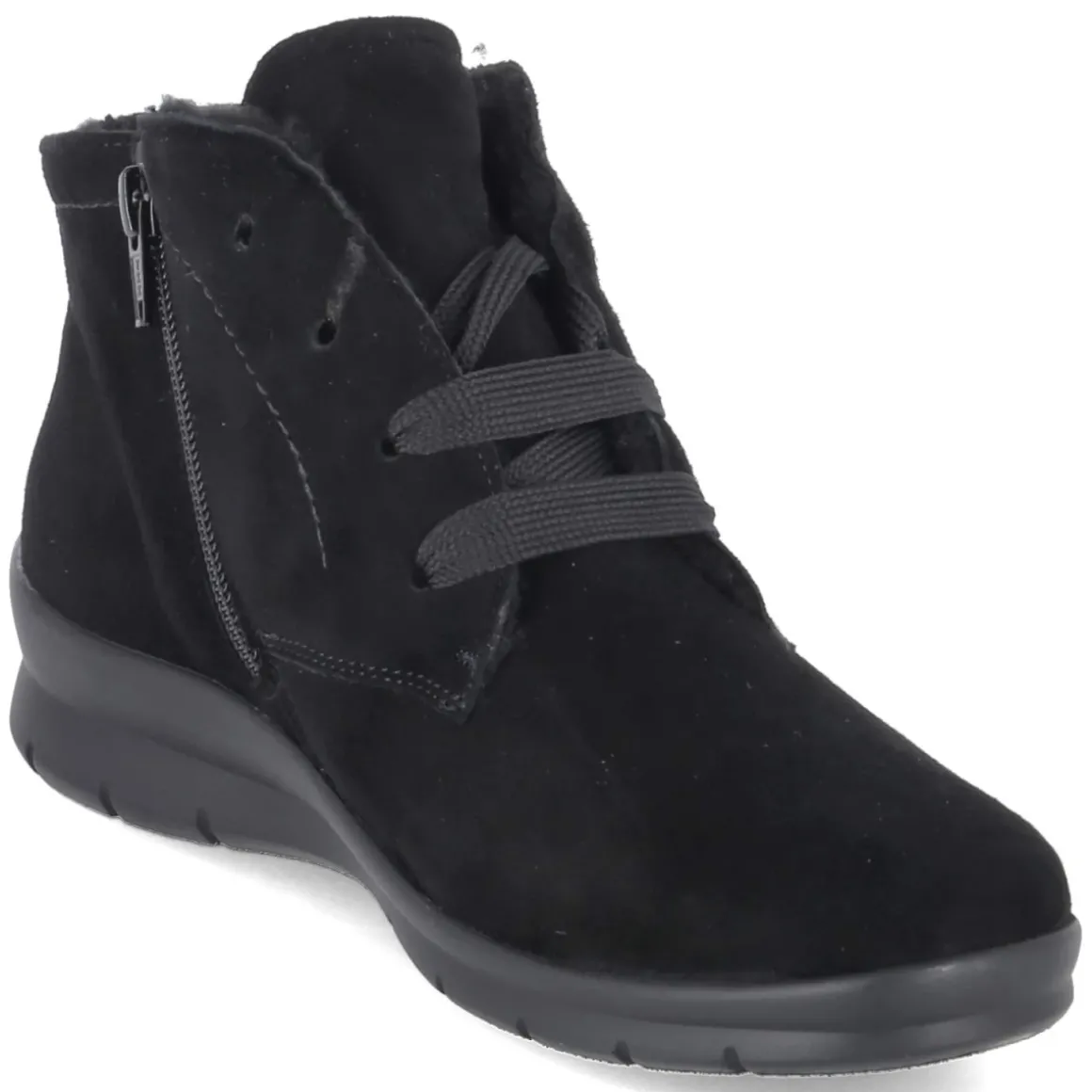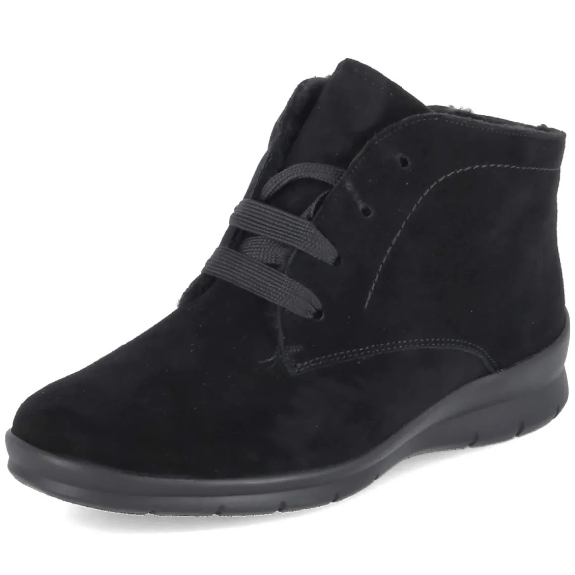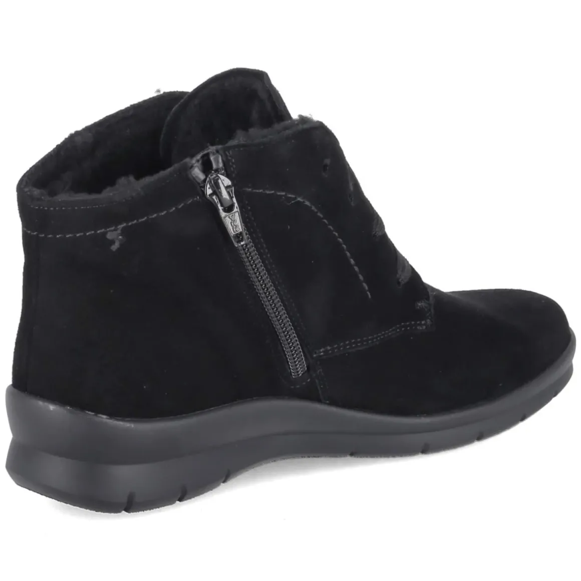 Die Stiefeletten XENIA von Semler verbinden Komfort und zeitlosen Stil. Das schwarze Rauleder mit samtiger Oberfläche verleiht dem Modell eine edle Tiefe, während die runde Schuhspitze und das geringe Gewicht für entspannte Schritte im Alltag stehen. Innen sorgt ein weiches Warmfutter für behagliche Temperaturen an kalten Tagen. Praktisch und elegant zugleich ist die Kombination aus Schnürung und seitlichem Reißverschluss, die das An- und Ausziehen besonders bequem macht. Das Wechselfußbett ermöglicht individuelles Anpassen oder das Tragen eigener Einlagen, die textile Decksohle ergänzt den sanften Tragekomfort. Dank normal ausfallender Passform gelingt die Größenwahl unkompliziert. Modetipp: Der monochrome Stil der XENIA harmoniert hervorragend mit einem wolligen Mantel in Kamel oder Grau und cropped Denim; ein schwarzer Lederbeutel rundet den cleanen Look smart ab.