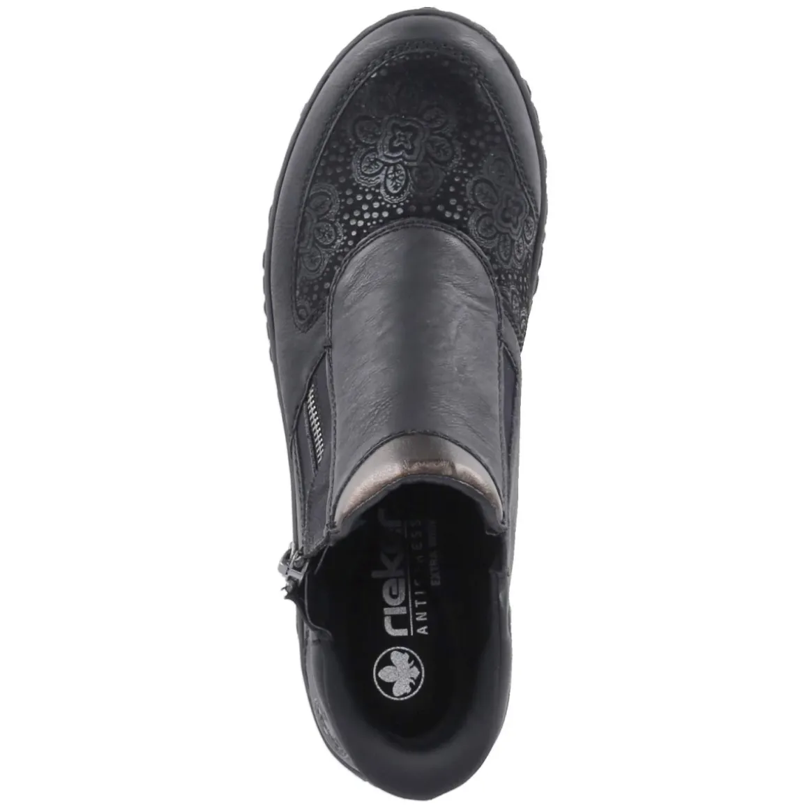 Diese Damen-Stiefeletten von Rieker setzen auf Komfort und zurückhaltende Eleganz. Schwarzes Obermaterial aus Textil und Synthetik mit pflegeleichter Oberfläche wird von dezent gemusterten Textilpartien stilvoll akzentuiert. Der Reißverschluss und ein seitlicher Elastikeinsatz sorgen für einen unkomplizierten Einstieg, während die leicht stretchige Zone im Halluxbereich zusätzlichen Spielraum bietet. Rund gearbeitete Schuhspitzen, ein verstärkter Zehenbereich und die dünne, flexible sowie rutschfeste Laufsohle unterstützen einen entspannten Auftritt im Alltag. Innen verwöhnt ein leichtes Futter an kühlen Tagen, die Decksohle aus Textil fühlt sich angenehm an. Das Wechselfußbett ermöglicht individuelle Einlagen, der Fit fällt normal aus. Modetipp: Besonders schön zu knöchellangen Straight-Jeans und einem Oversize-Wollmantel, alternativ zu Midikleid und blickdichter Strumpfhose.