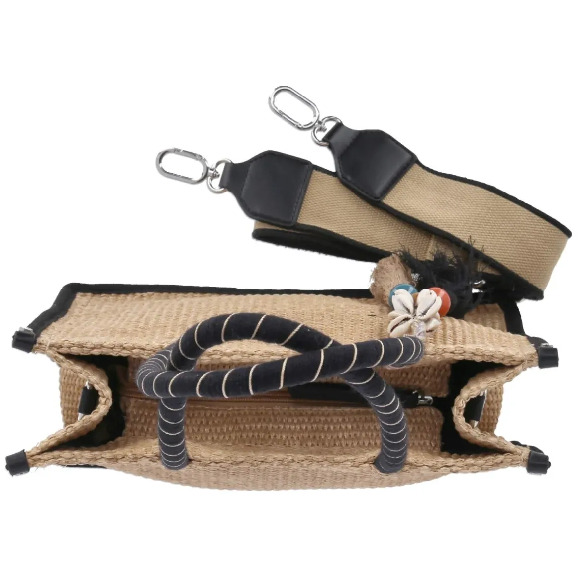 Diese Damen-Tote-Bag in Beige verbindet sommerlich geflochtene Optik mit durchdachter Funktion. Das Format von ca. 26 x 30 x 13 cm fasst rund 10 Liter und bleibt dank Reißverschluss-Hauptfach sicher geschlossen. Innen sorgen ein Handysteckfach und ein zusätzliches Reißverschlussfach für Übersicht. Schwarze Elemente setzen einen modernen Kontrast, während der Quastenanhänger mit bunten Holzperlen und Muscheln das Design verspielt abrundet. Zwei lange Henkel von ca. 50 cm bieten angenehmes Tragen in der Hand oder über der Schulter; für mehr Flexibilität steht ein verstellbarer, abnehmbarer Schultergurt mit ca. 130 cm Länge bereit. So wird die Tasche zum vielseitigen Begleiter vom Stadtbummel bis zum Ausflug. Modetipp: Zu einem beigen Leinenkleid und geflochtenen Mules entsteht ein harmonischer Natural-Look mit Stil.