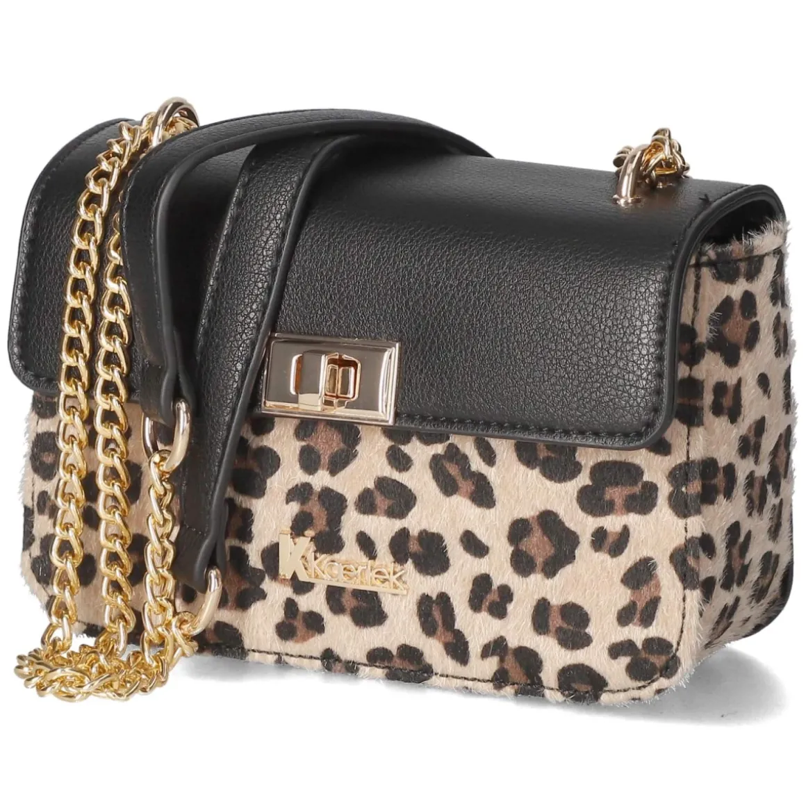 Diese Umhängetasche für Damen vereint kompaktes Format mit markantem Auftritt. Mit Maßen von ca. 12 x 18 x 6 cm und einem Volumen von etwa 1 Liter bietet sie Platz für Smartphone, Kartenetui und Schlüssel, während der stabile Korpus die Form zuverlässig hält. Der beige Grundton wird von Einsätzen aus schwarzem Kunstleder und weichem Kunstfell in Leopard-Optik kontrastiert, akzentuiert durch goldfarbene Elemente und einen prägnanten Markenschriftzug. Der Überschlag mit Drehverschluss schließt sicher, innen sorgen ein Reißverschlussfach und ein Steckfach für Übersicht. Die verstellbare Schulterkette mit ca. 140 cm erlaubt Tragevarianten von Schulter bis Crossbody. Modetipp: Als Eyecatcher zu monochromen Looks in Schwarz oder Creme stylen, etwa mit schmalem Rollkragen und weit geschnittener Hose, damit der Animal Print elegant im Mittelpunkt steht.