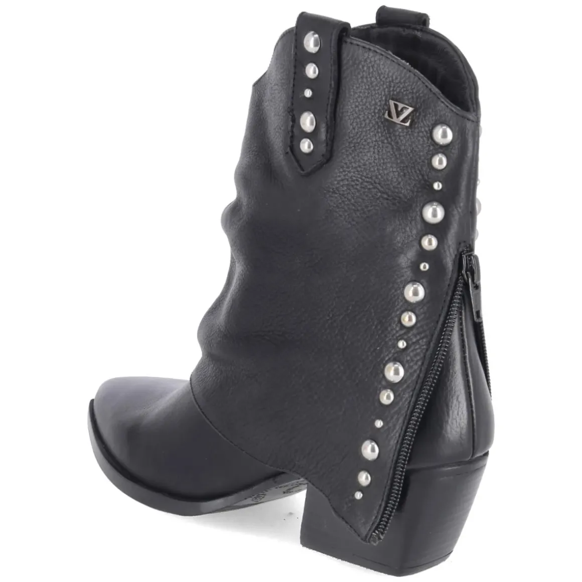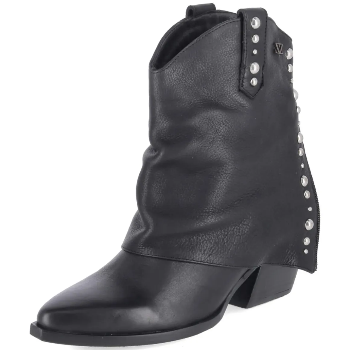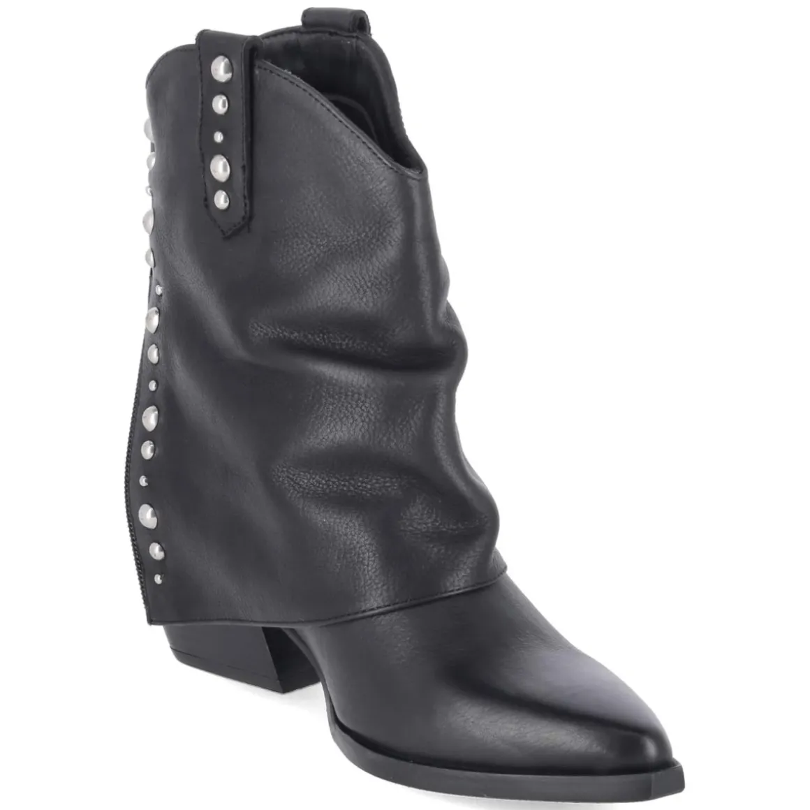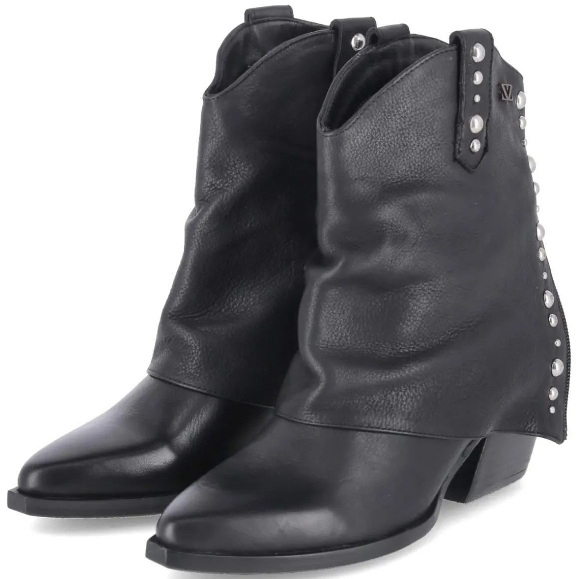 Die Westernstiefeletten YARA von LAZAMANI setzen mit spitzer Silhouette und extravagant umgeschlagener Krempe samt silbernem Nietenbesatz ein markantes Statement. Feines Glattleder und langlebiges Echtleder im Schaft treffen auf eine weiche Lederdecksohle, die jeden Schritt angenehm abfedert. Der kubanische Blockabsatz mit 6 cm Höhe verleiht Stabilität und streckt elegant, während die flexible, rutschfeste Laufsohle sicheren Halt auf unterschiedlichen Untergründen gibt. Dank des Designs ohne Verschluss gleitet der Fuß bequem in den Schuh, der Größenhinweis fällt normal aus sorgt für passgenauen Komfort. Das modische Design wird durch den Zierreißverschluss an der Ferse lässig akzentuiert und passt vom City-Look bis zum Abendauftritt. Modetipp: Für modernen Western-Chic eine dunkle Slim-Jeans in den Schaft stecken, dazu ein fließendes Seidentop und einen Oversize-Blazer kombinieren, feiner Silber-Schmuck greift den Nietenbesatz gekonnt auf.