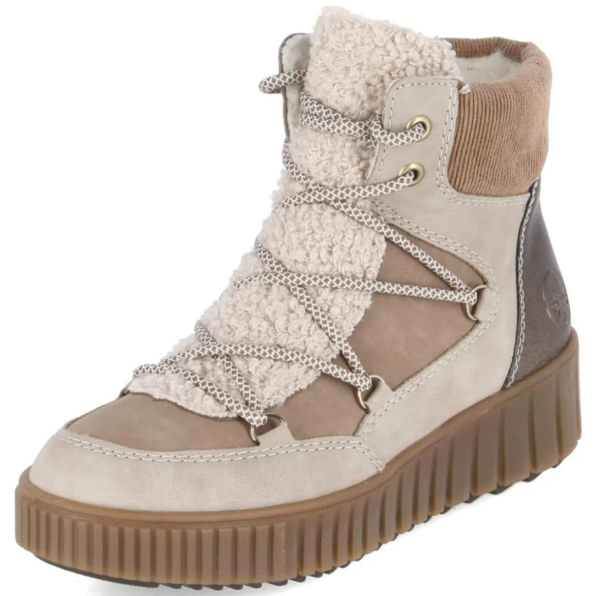 Wintertauglicher Komfort trifft urbanen Stil: Die Rieker Damen-Winterboots in Beige setzen auf einen modernen Material-Mix aus Textil und Synthetik und punkten mit einem 4 cm hohen Plateau, das Auftritt dämpft und dezent Höhe schenkt. Warmfutter inklusive kuscheligem Teddyfutter umschließt den Fuß, der gepolsterte Einstieg und das weich gepolsterte, herausnehmbare Fußbett steigern den Tragekomfort im Alltag. Schnürsenkel sorgen für die individuelle Weitenregulierung, der seitliche Reißverschluss für den bequemen Einstieg. Die runde Spitze, die textile Decksohle sowie verstärkte Zehen- und Fersenpartien machen das Modell robust und alltagstauglich. Mit normal ausfallender Passform ideal für Erwachsene, die zuverlässige Begleiterinnen für kalte Tage suchen. Modetipp: Zu Wollmantel, Straight-Jeans und grobem Strick in Creme entsteht ein stilvolles Ton-in-Ton-Winteroutfit.
