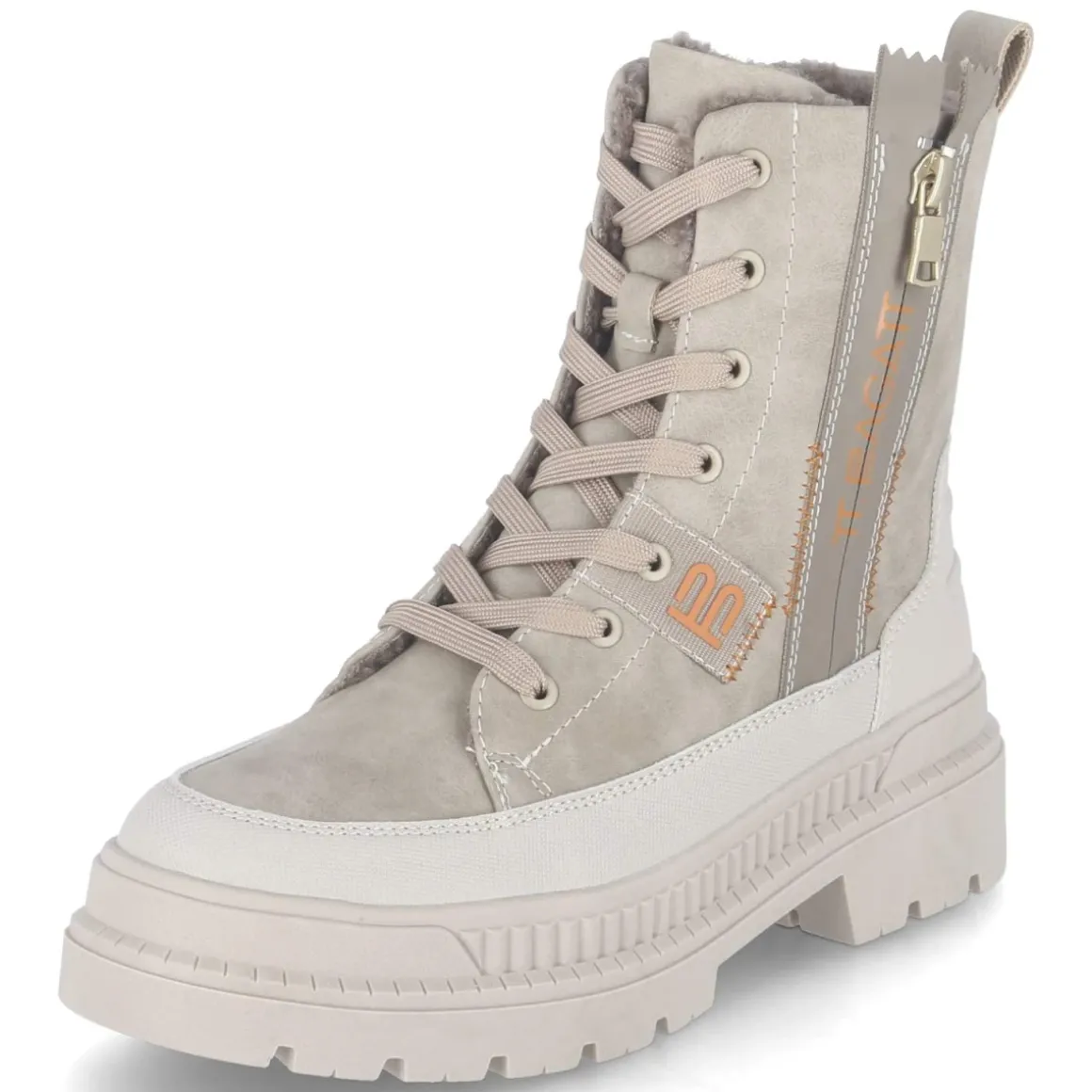 Die Winterboots von TT.Bagatt verbinden wetterfeste Funktion mit moderner Optik in sanftem Beige. Ein 4 cm hoher Blockabsatz und der verstärkte Fußrahmen sorgen für Stabilität, während die rutschfeste Profilsohle auf glatten Wegen greift. Das warme Futter und die textile Decksohle umhüllen den Fuß angenehm, die runde Spitze bietet zusätzlichen Raum. Obermaterial aus pflegeleichtem Synthetik nimmt den Alltag gelassen, Schnürung und seitlicher Reißverschluss ermöglichen schnelles An- und Ausziehen, unterstützt von der Anziehlasche. Orange Markendetails und der Zierreißverschluss an der Außenseite setzen dezente Akzente. Der Schnitt fällt normal aus und begleitet zuverlässig durch kalte Tage. Modetipp: Zu cremefarbenem Strick, wattiertem Parka und gerader Denim getragen entsteht ein ruhiger Winterlook, den die orangefarbenen Details frisch akzentuieren.