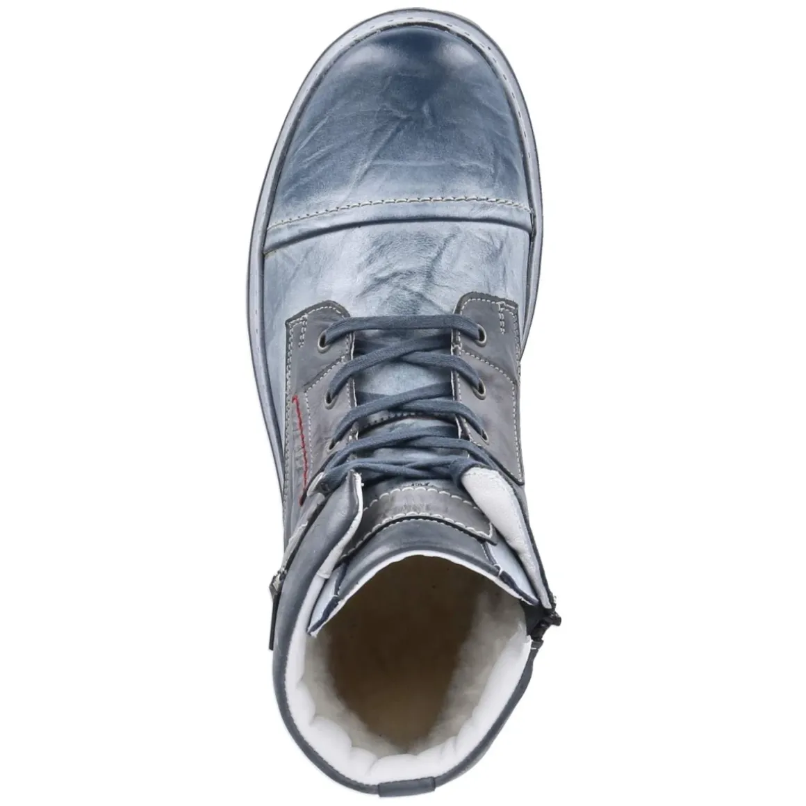 Der Herren-Winterboot von Krisbut verbindet robuste Funktion mit einem souveränen Auftritt. Glattes, langlebiges Echtleder in sattem Blau und eine dezent marmorierte Oberfläche prägen den Look, während der verstärkte Fersen- und Zehenbereich zusätzliche Stabilität gibt. Warmfutter, lederne Decksohle und ein herausnehmbares Fußbett sorgen für ein angenehmes Klima und individuellen Komfort. Die Kombination aus Schnürsenkeln und seitlichem Reißverschluss erleichtert das An- und Ausziehen, unterstützt von Anziehlasche und leicht gepolstertem Einstieg. Mit rund zulaufender Spitze, 3 cm hohem Blockabsatz und flexibler Profilsohle im Used Look eignet sich der Schuh für lange Wintertage in der Stadt. Der Schnitt fällt normal aus und strahlt dank klarer Linien Wertigkeit aus. Modetipp: Zur Raw-Denim, einem grauen Wollmantel und grob gestricktem Schal entsteht ein lässig-eleganter Winterstil, den ein Lederhandschuh in Dunkelblau stimmig abrundet.
